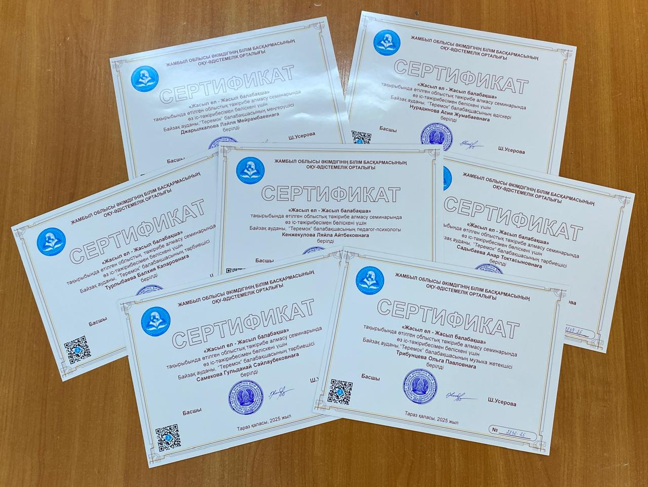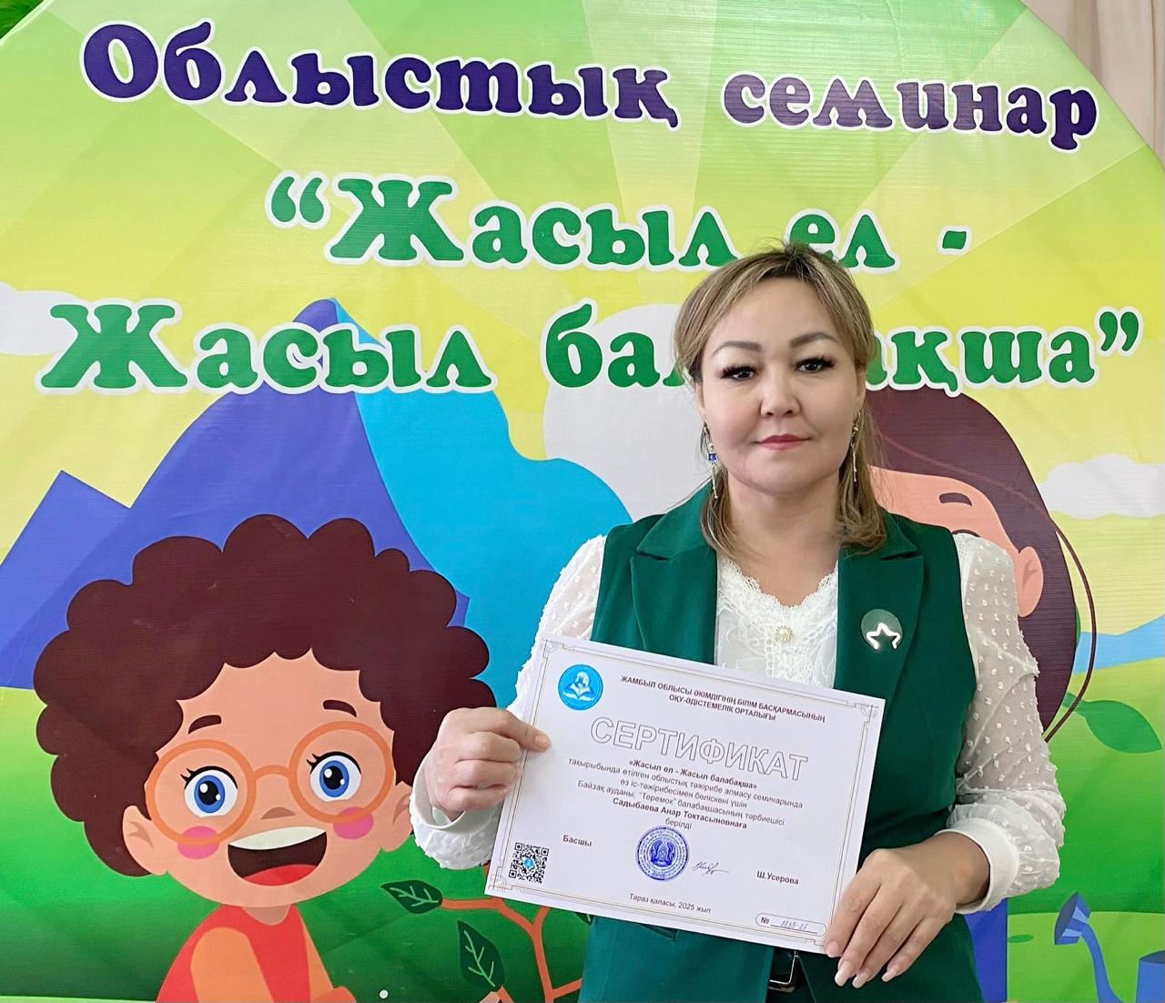 21.11.2025ж. күні Жамбыл облысы әкімдігінің оқу-әдістемелік орталығының ұйымдастыруымен «Теремок» балабақшасында «Жасыл ел-Жасыл балабақша» тақырыбында облыстық тәжірибе алмасу семинары өткізілді. Семинарда «Жасыл балабақша» желісін көбейту, мектепке дейінгі ұйымда тәрбиеленушілердің экологиялық мәдениетін қалыптастыру және экологиялық сауаттылықты арттыру жолдары көрсетіліп, педагогтер тиімді әдіс-тәсілдерін ұсынып, іс-тәжірибелерімен бөлісті.