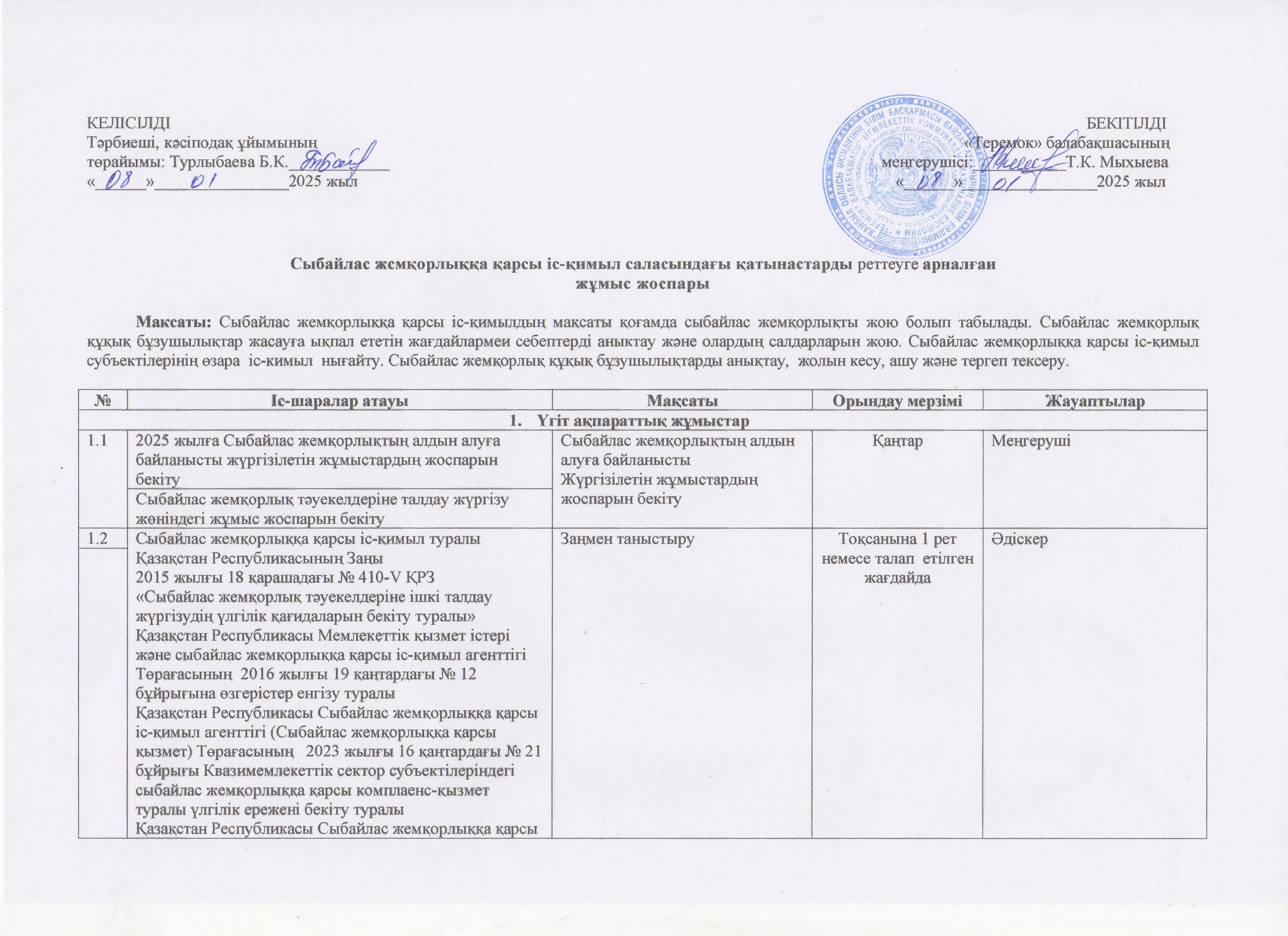 08 январь 2025 0 1 2 3 4 5 Сыбайлас жемқорлық тәуекелдеріне ішкі талдау жүргізу жөніндегі жұмыс жоспары