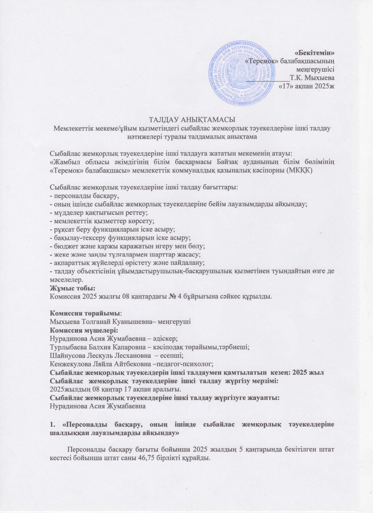 17 февраль 2025 0 1 2 3 4 5 Сыбайлас жемқорлық тәуекелдеріне ішкі талдау нәтижелері туралы талдамалық анықтама