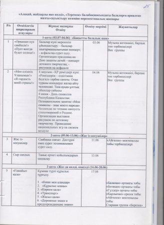 Жаз мезгілінің тәрбие мен оқытудың сауықтыру жұмыс жоспары » "Теремок" балабақшасы