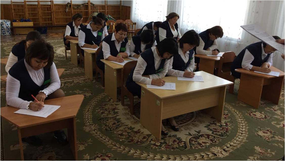 Уақытпен үндескен бастаманы қызу қолдап отырған «Теремок» балабақшасы ұжымында Аудандық білім бөлімінің тапсырмасына сәйкес, «Рухани жаңғыру» тақырыбында диктант жұмысы алынды. Латыннегізді қазақ әліпбиімен 13 педагог диктант жазып, өздерінің тілге деген құрмет, ықыластарын танытты.