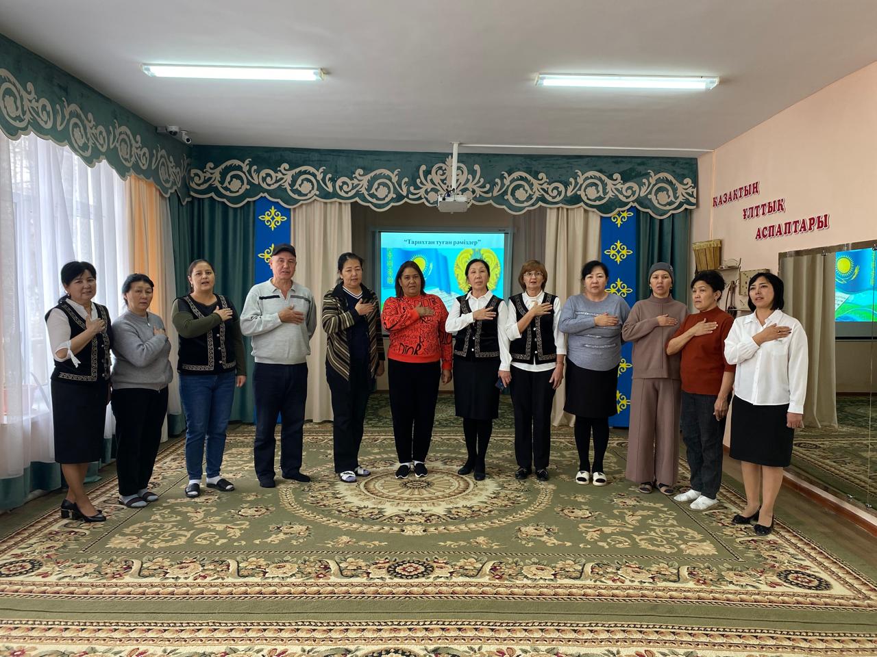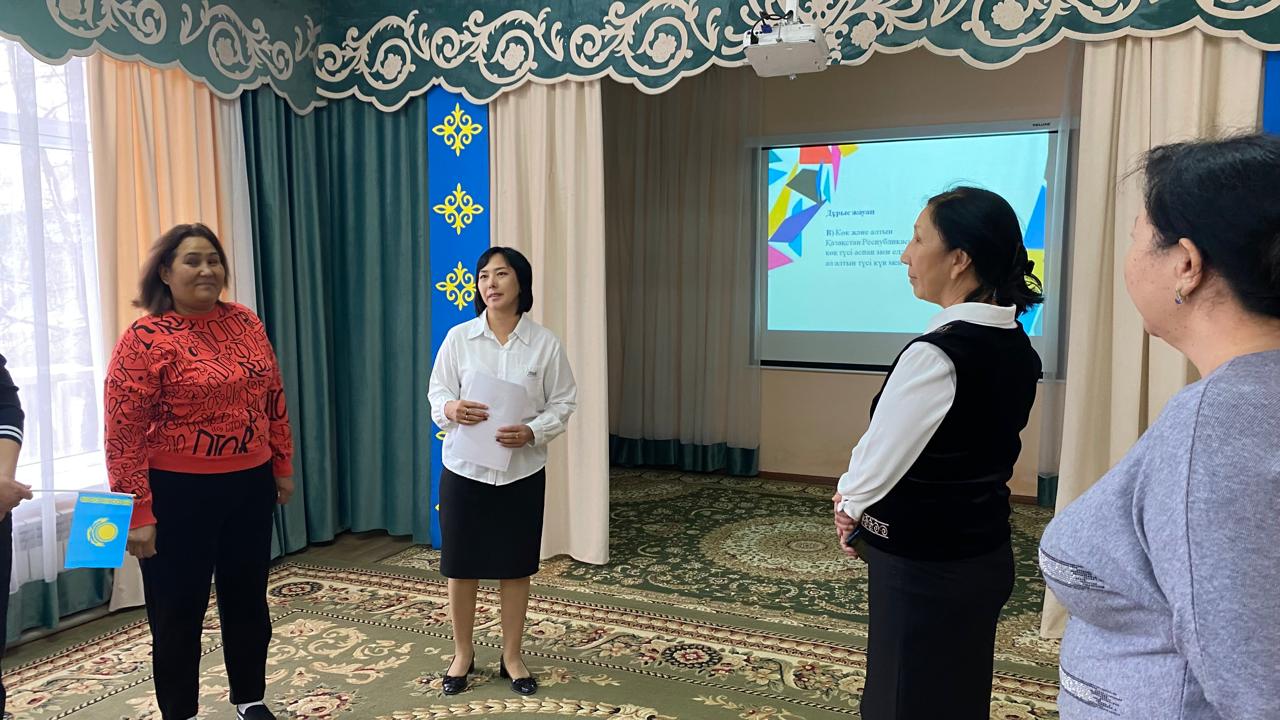 Мақсаты: Қызметкерлер арасында Қазақстан Республикасының мемлекеттік рәміздері туралы білімді арттыру, маңыздылығын түсіндіру, ұлттық құндылықтарды құрметтеуе тәрбиелеу. Патриотизмді дамыту, ұжымда бірлікті нығайтуға ықпал ету.
