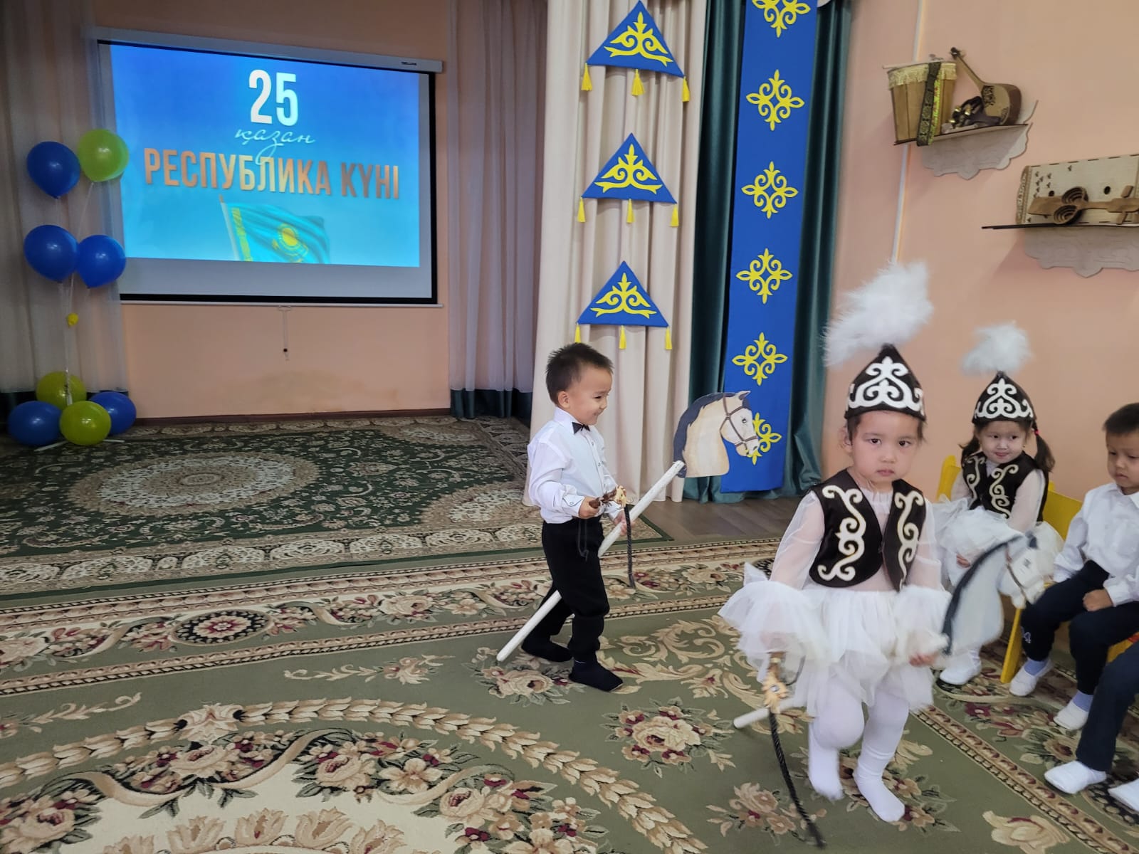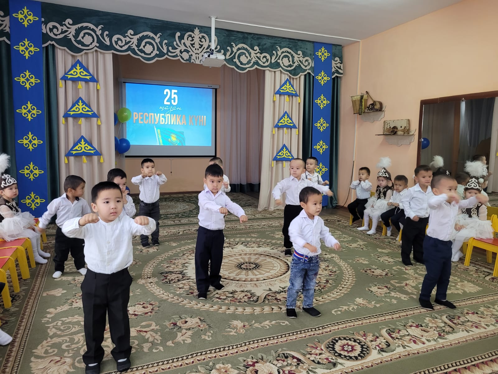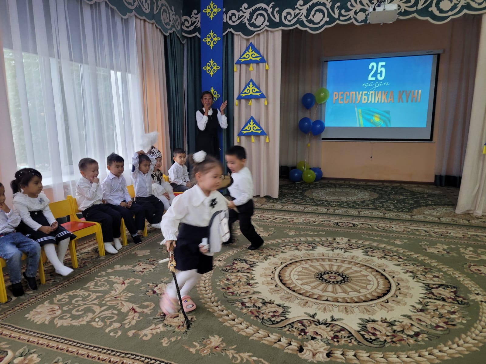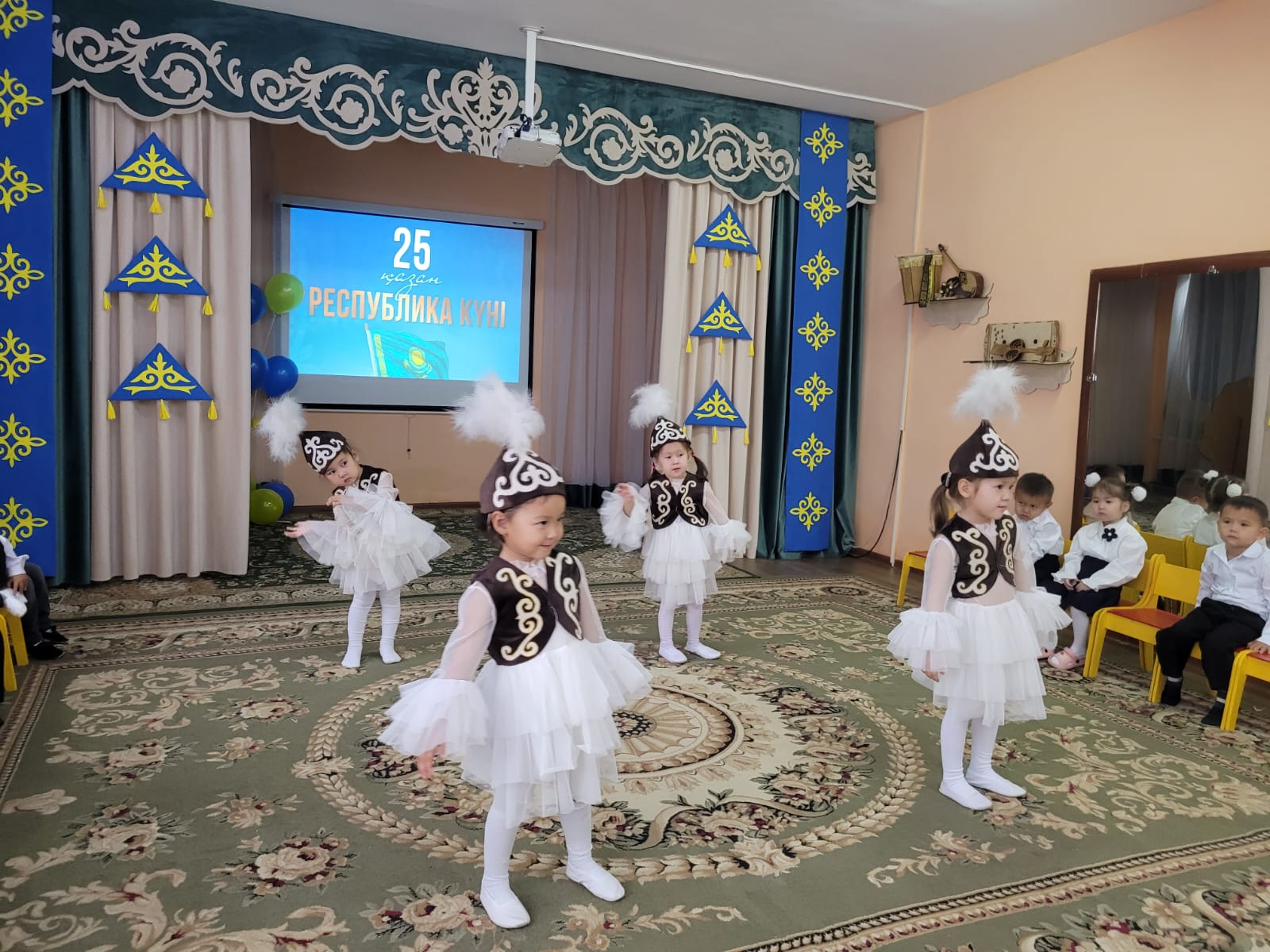 25-қазан Республика күніне орай «Қарлығаш» ортаңғы тобында «Менің Отаным-Қазақстан!» атты ертеңгілік өтті. Іс-шара барысында балаларға Отан туралы, Қазақстан Республикасының рәміздері туралы түсінік берілді. Еліне, туған жерге деген сүйіспеншіліктерін арттыру мақсатында ұлттық ойындары ойнатылды. «Қыз қуу», «Арқан тарту». «Құстар», «Тұлпар» биін биледі. «Менің Отаным» әнін орындап, тақпақтар айтты.