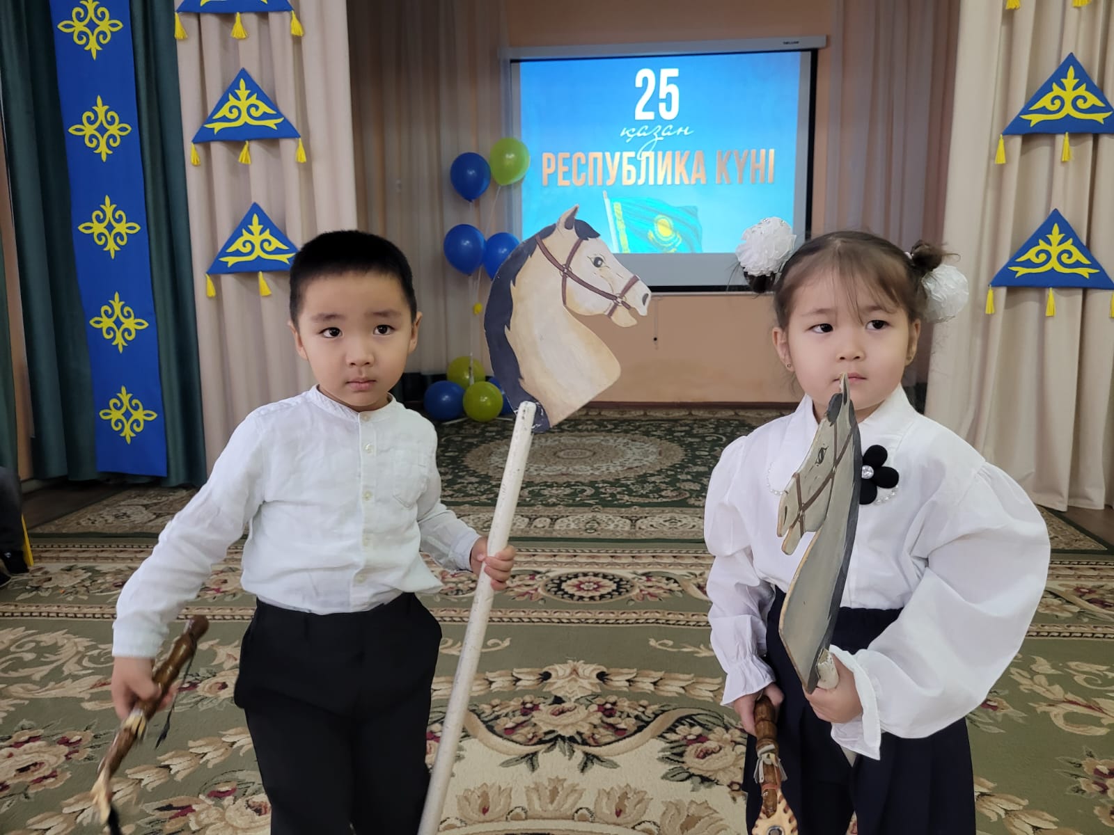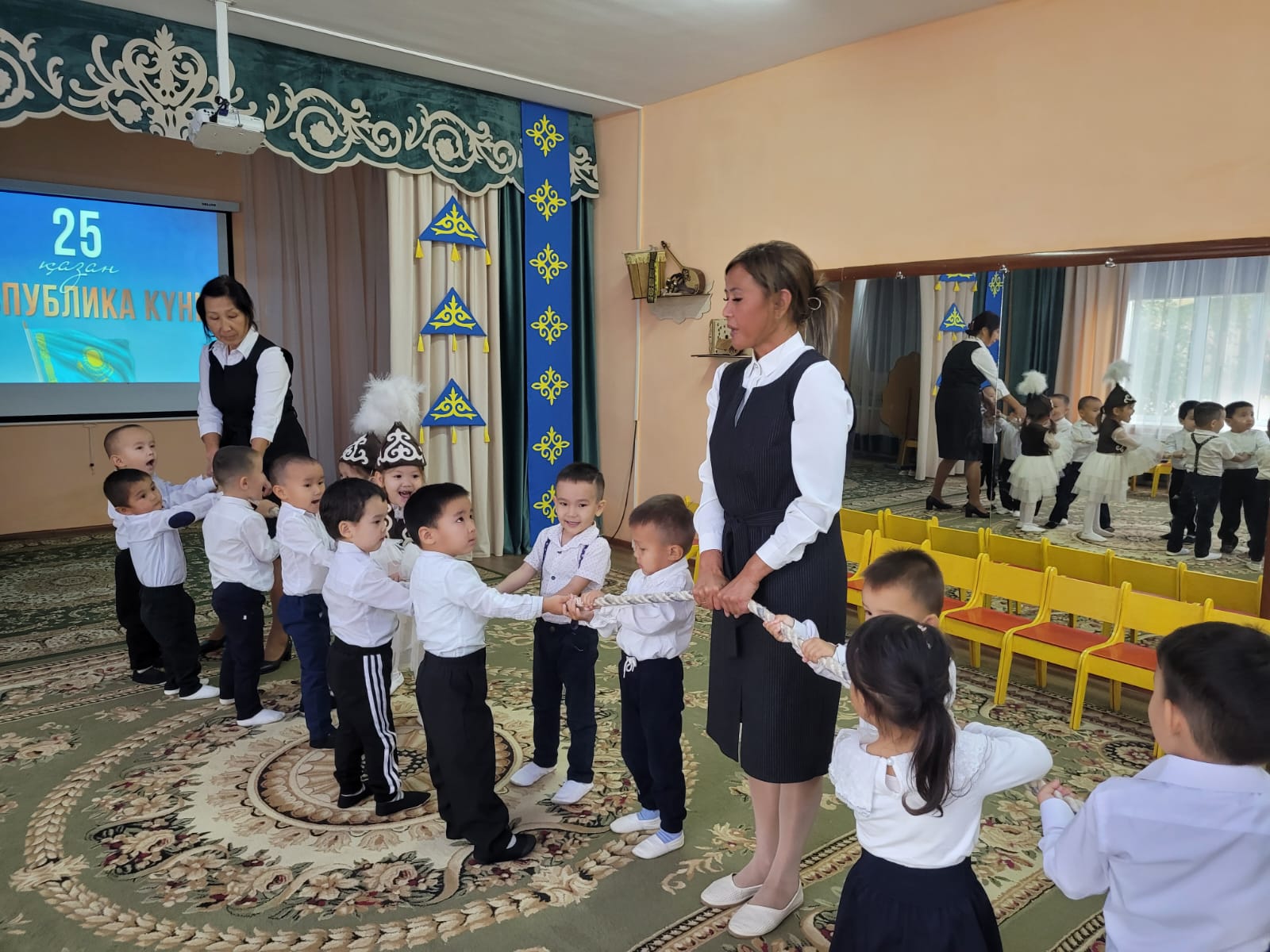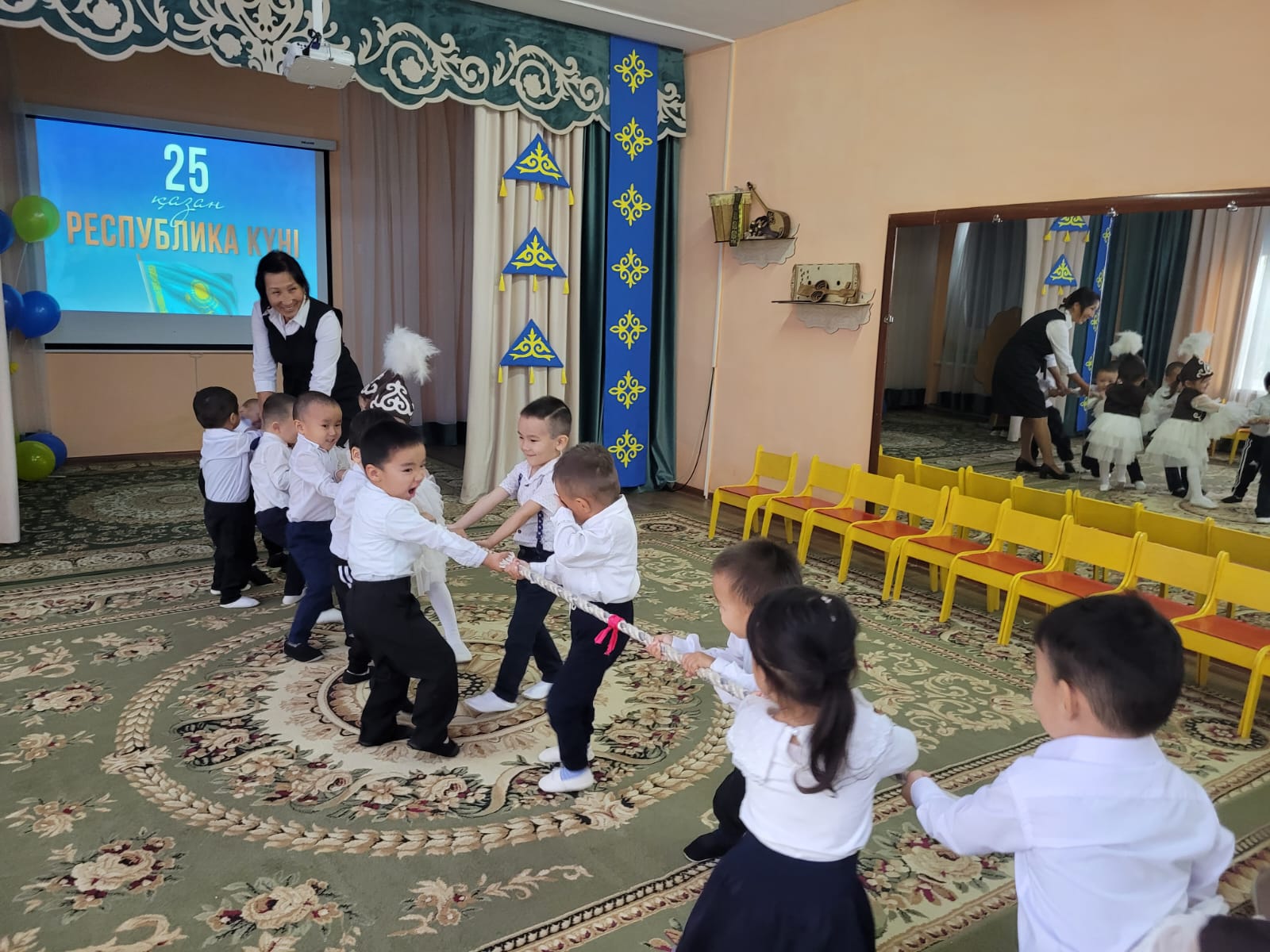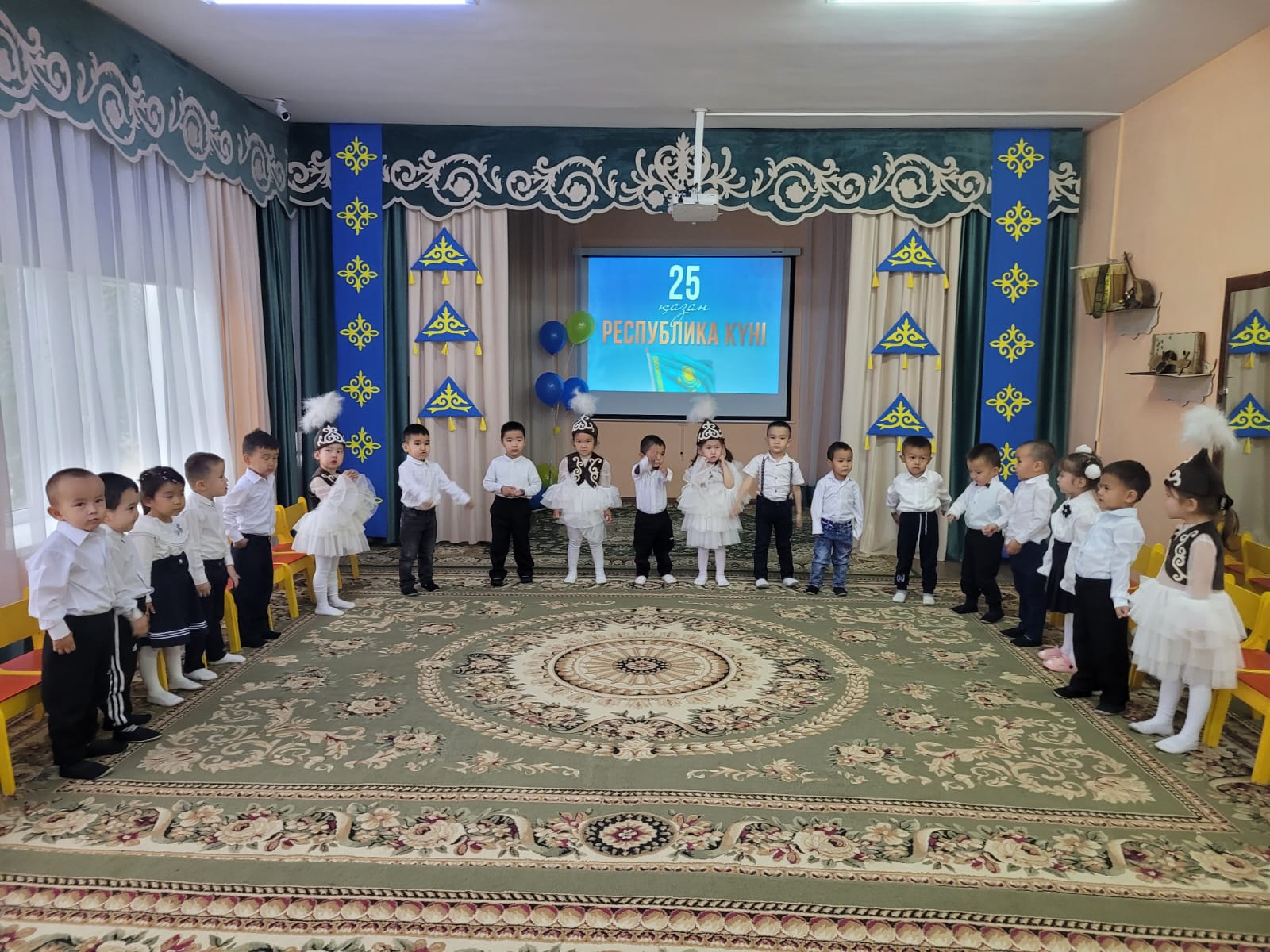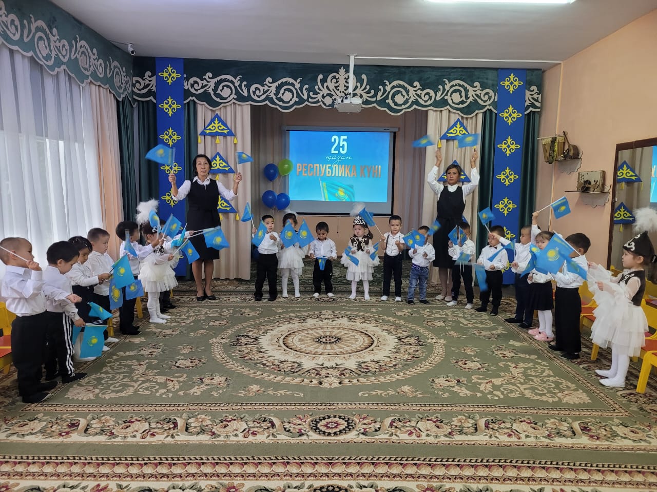 25-қазан Республика күніне орай «Қарлығаш» ортаңғы тобында «Менің Отаным-Қазақстан!» атты ертеңгілік өтті. Іс-шара барысында балаларға Отан туралы, Қазақстан Республикасының рәміздері туралы түсінік берілді. Еліне, туған жерге деген сүйіспеншіліктерін арттыру мақсатында ұлттық ойындары ойнатылды. «Қыз қуу», «Арқан тарту». «Құстар», «Тұлпар» биін биледі. «Менің Отаным» әнін орындап, тақпақтар айтты.