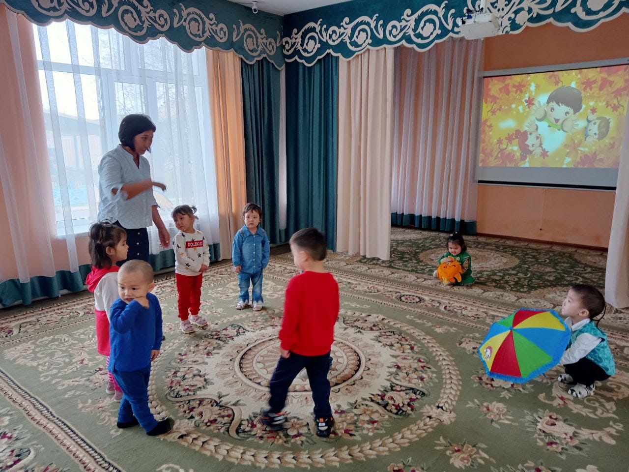 Педагог-психолог Л.Кенжекулова ата-аналармен балалардың «Күн, жаңбыр, жел» ойынын ойнатты. Балалардың бірі Күн болды,