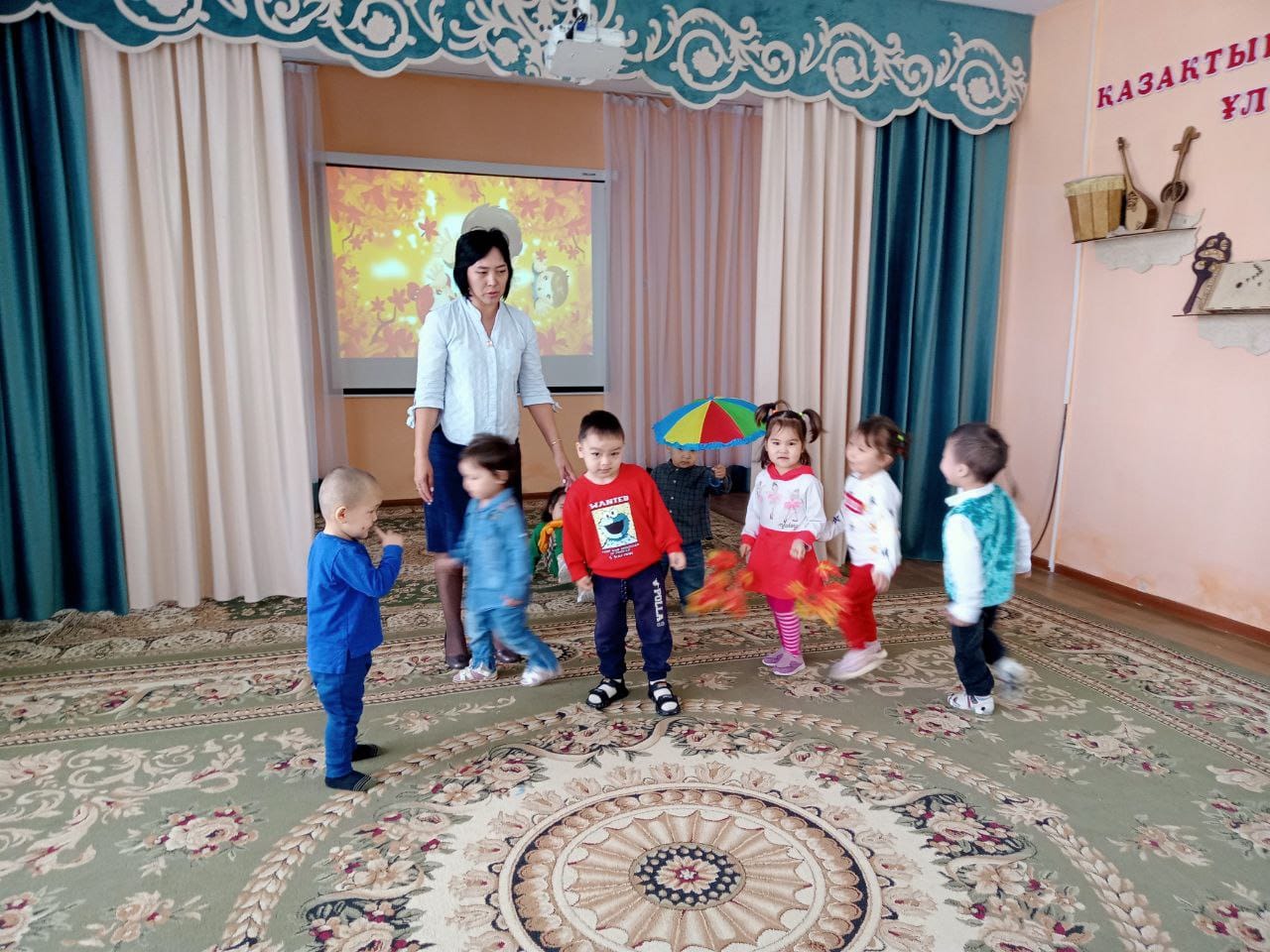 «Жел тұрды» дегенде, қолындағы сары жапырақтарды желбіретіп, жел тұрғанын көрсетті. Балалар арлы-берлі желмен ұшып ойнады.