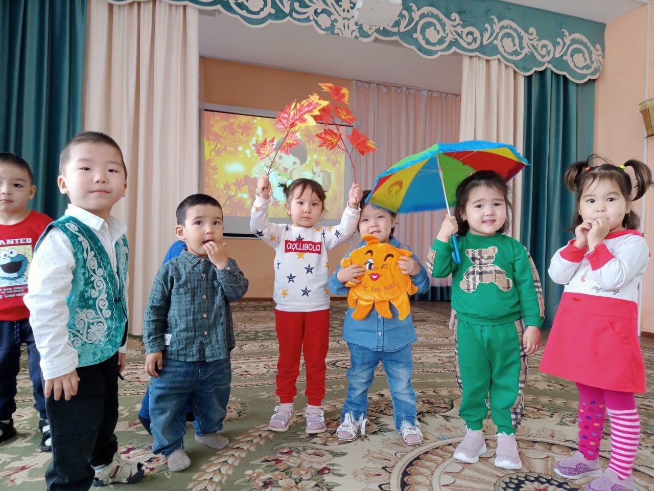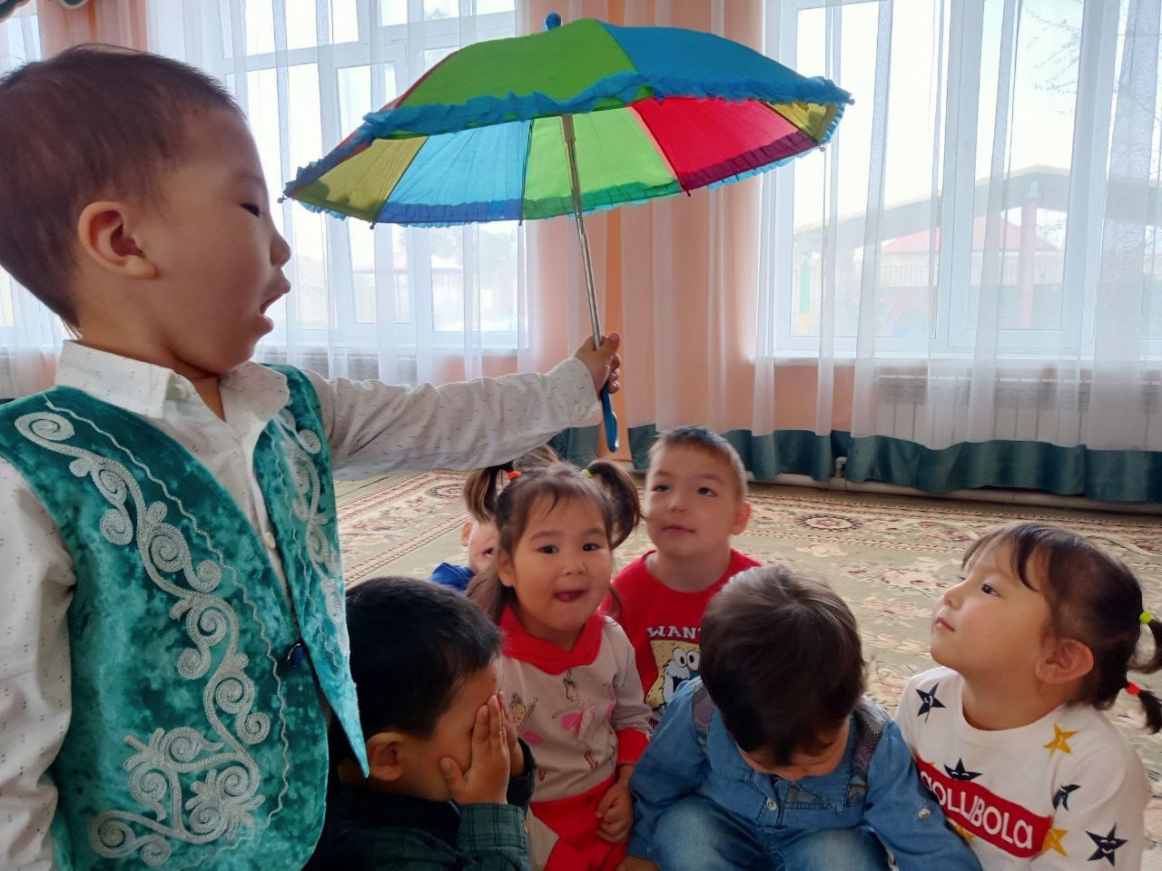«Күн бұлттанып, жаңбыр жауды» дегенде ортаға Қолшатыр ұстаған бала шығып,барлығы қолшатырдың астына тығылды.