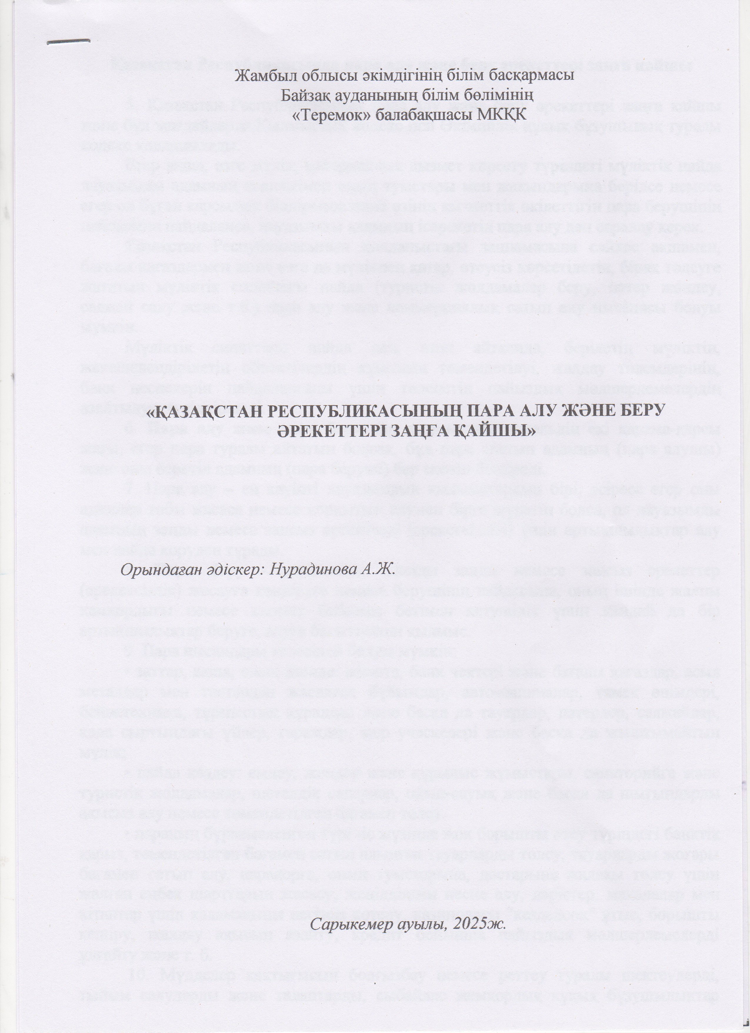 Казақстан Республикасының пара алу және беру әрекеттері заңғы қайшы » "Теремок" балабақшасы