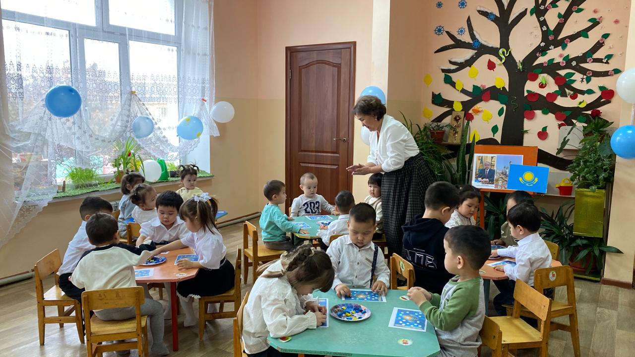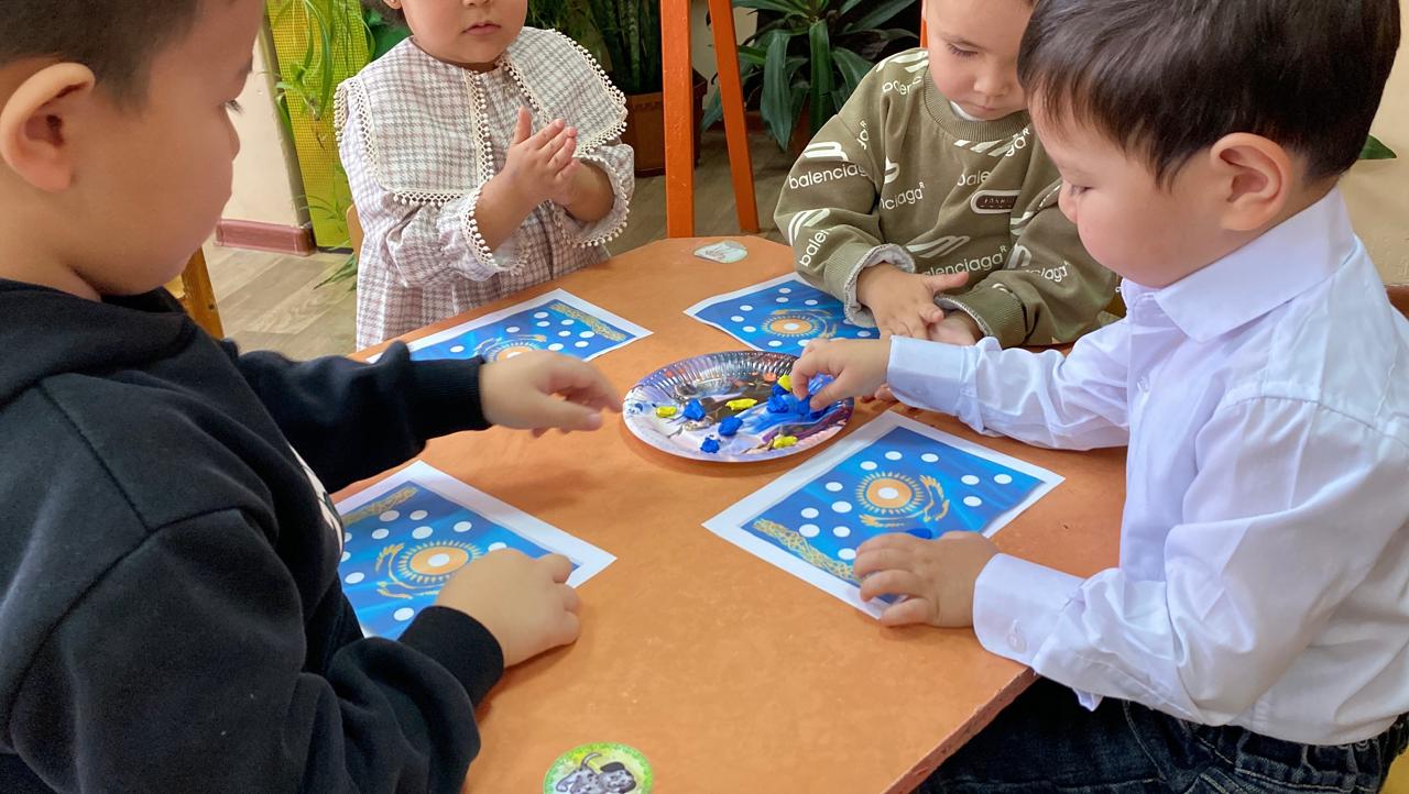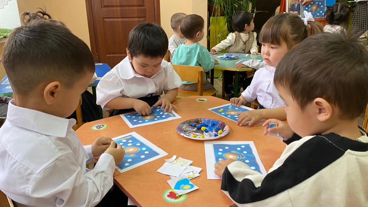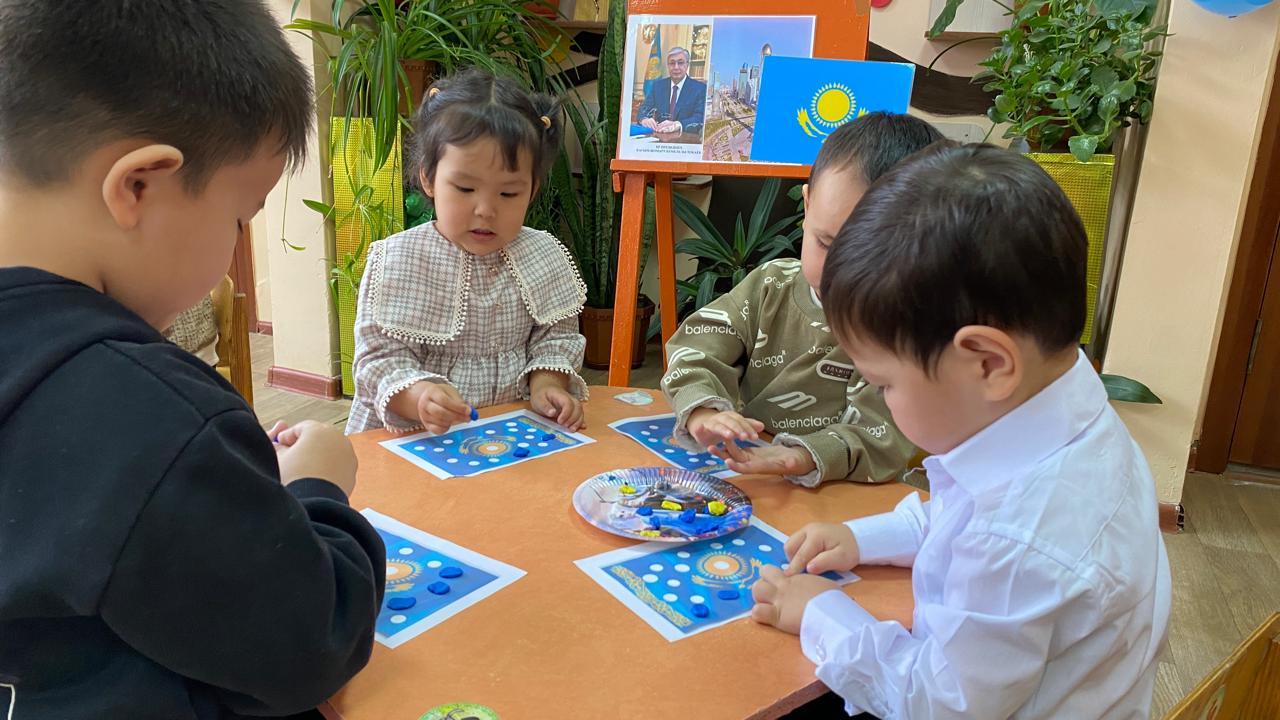 "Адал азамат" біртұтас тәрбие бағдарламасы аясында “Тәуелсіз елім – Қазақстан” тақырыбында тәрбие сағаты “Балапан” ортаңғы тобында өткізілді. Балалар Қазақстан туының дөңгелек белгіленген бөліктерін ермексазбен толтырып, мемлекеттік рәміздерге құрмет көрсетті. Сонымен қатар, балалар алақандарын жүрекше етіп жасап, туын ұстап тұрып бір-біріне және еліне жақсы тілектер айтты. Іс-әрекет балалардың Отанға деген сүйіспеншілігін, достық пен бірлікті қалыптастыруға, сондай-ақ ұсақ қол моторикасын және шығармашылық қабілеттерін дамытуға бағытталды.