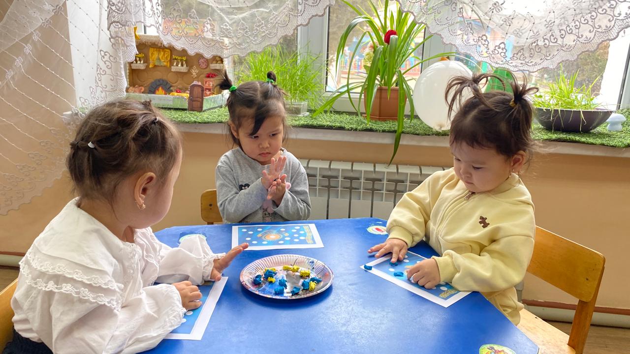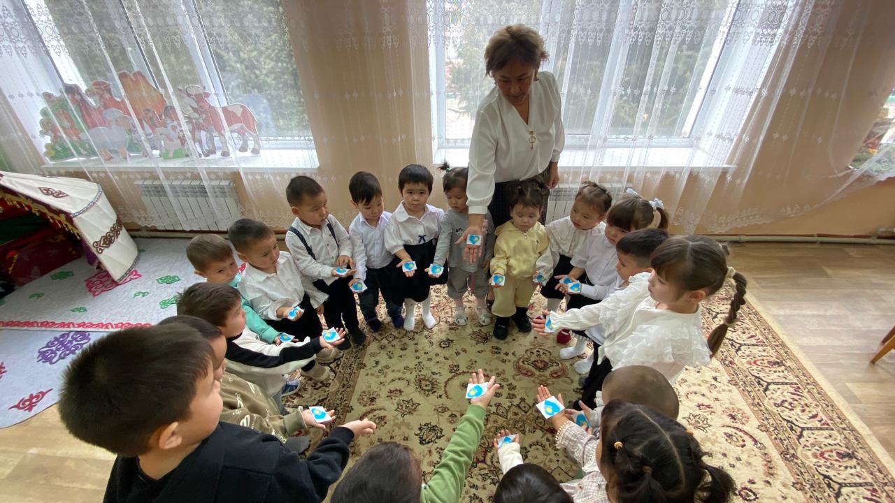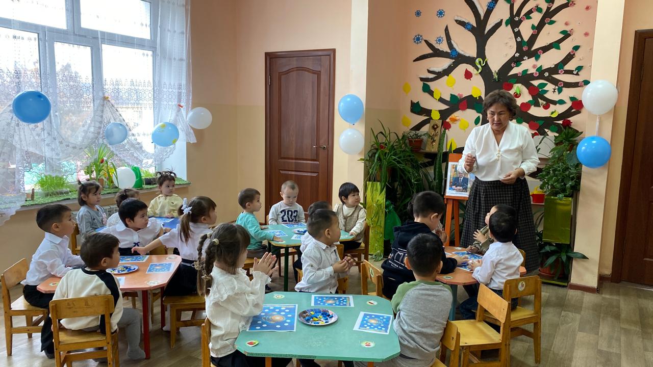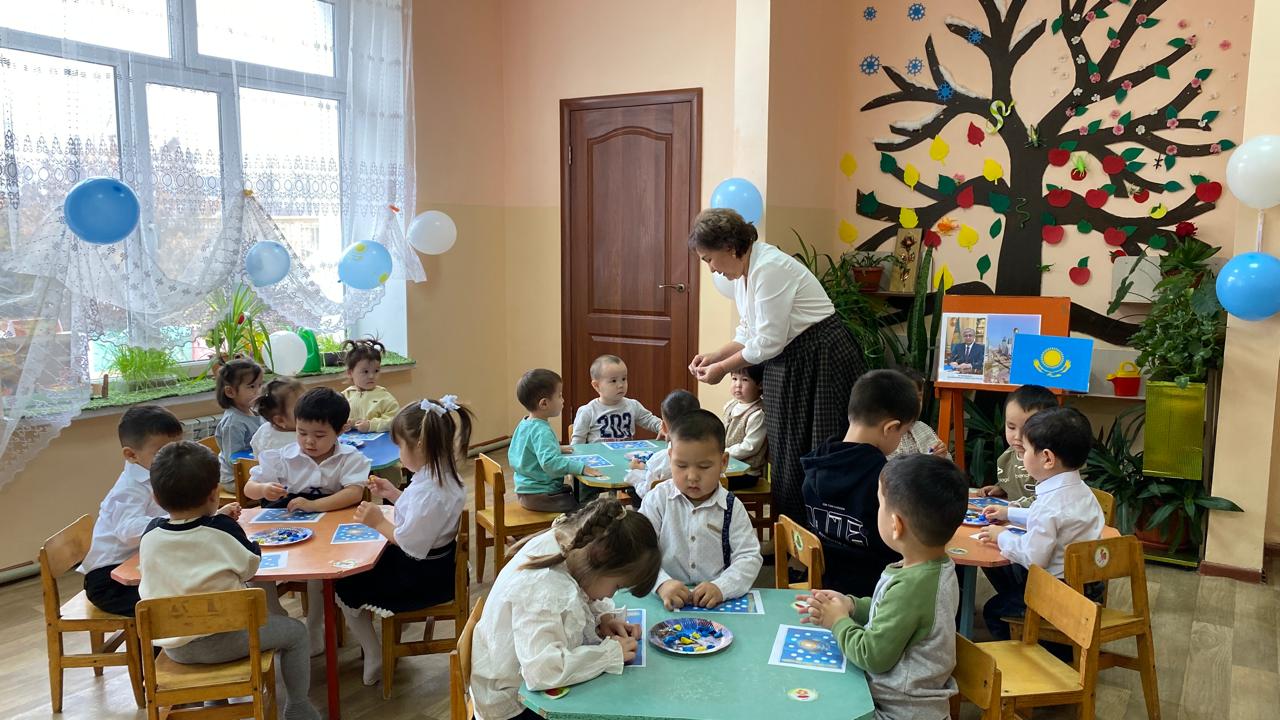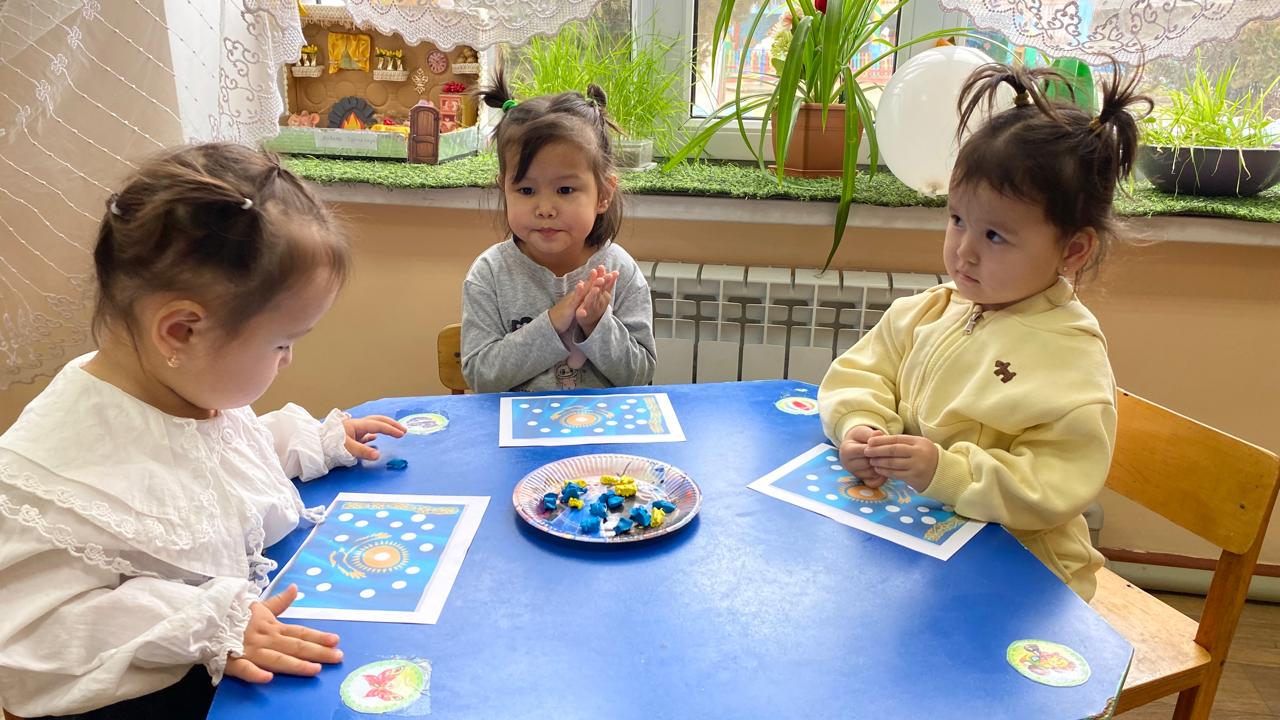 "Адал азамат" біртұтас тәрбие бағдарламасы аясында “Тәуелсіз елім – Қазақстан” тақырыбында тәрбие сағаты “Балапан” ортаңғы тобында өткізілді. Балалар Қазақстан туының дөңгелек белгіленген бөліктерін ермексазбен толтырып, мемлекеттік рәміздерге құрмет көрсетті. Сонымен қатар, балалар алақандарын жүрекше етіп жасап, туын ұстап тұрып бір-біріне және еліне жақсы тілектер айтты. Іс-әрекет балалардың Отанға деген сүйіспеншілігін, достық пен бірлікті қалыптастыруға, сондай-ақ ұсақ қол моторикасын және шығармашылық қабілеттерін дамытуға бағытталды.