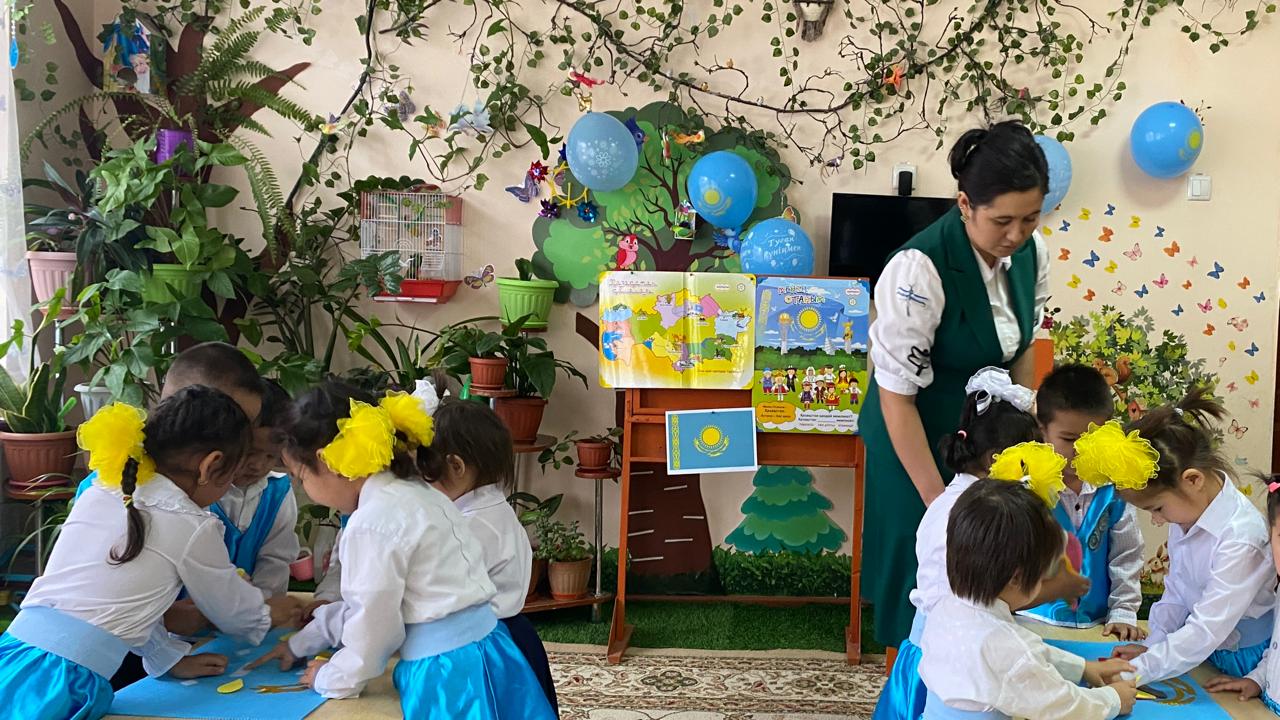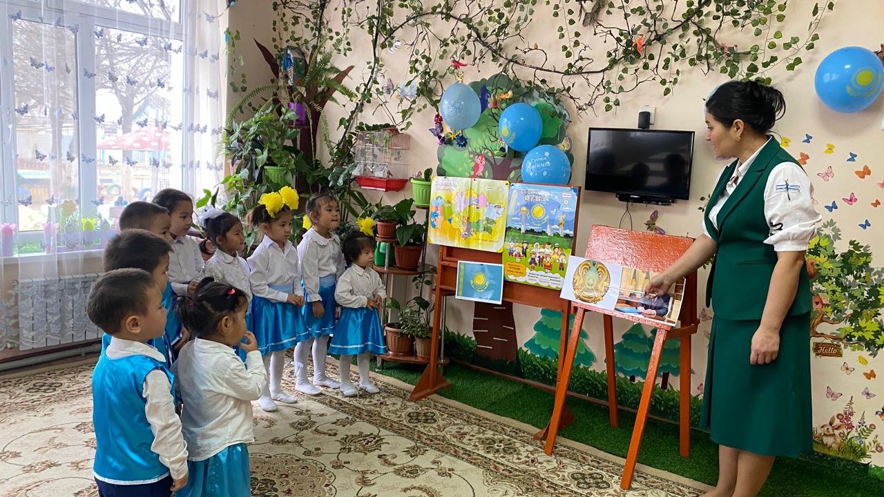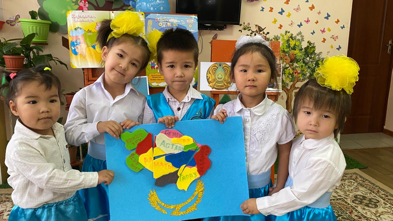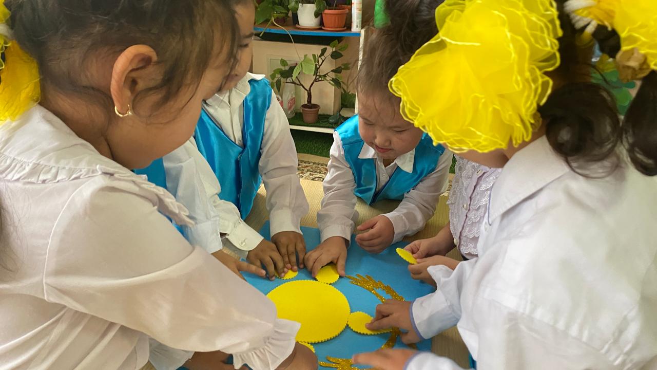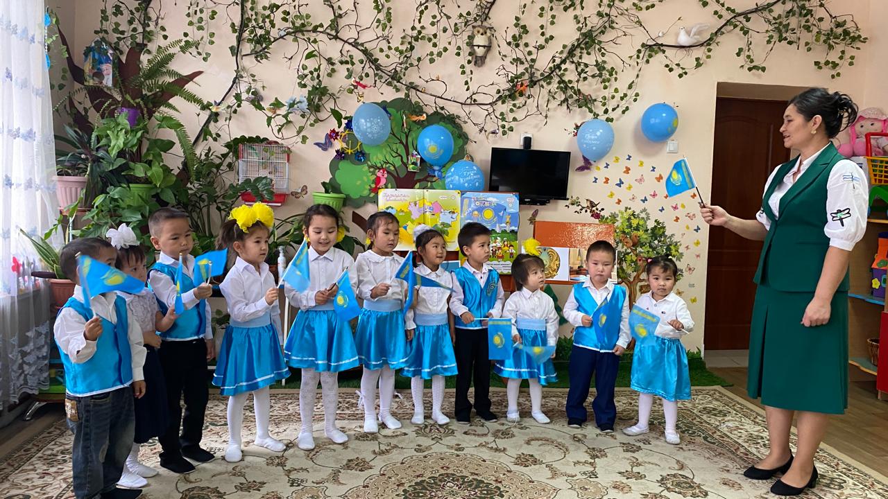 Ортаңғы “Гүлдер” тобында "Адал азамат" біртұтас тәрбие бағдарламасы аясында «Тәуелсіз елім – Қазақстан» тақырыбында тәрбие сағаты өткізілді. Іс-әрекет барысында балалар екі топқа бөлініп, шығармашылық жұмыстар жасады: бір топ күннің сәулелерін жапсырып, екінші топ Қазақстан картасын құрастырды. Сонымен қатар, балалар «Қыз қуу» ұлттық ойынын ойнап, қимыл-қозғалыс белсенділіктерін арттырды. Іс-әрекет балалардың Отанға деген сүйіспеншілігін, шығармашылық қабілеттерін, ұсақ қол моторикасын дамытуға және ұйымшылдық, достық сезімдерін қалыптастыруға бағытталды. Іс-шара қорытындысында балалар «Көк тудың желбірегені» әнімен мерекелік көңіл-күй сыйлады.