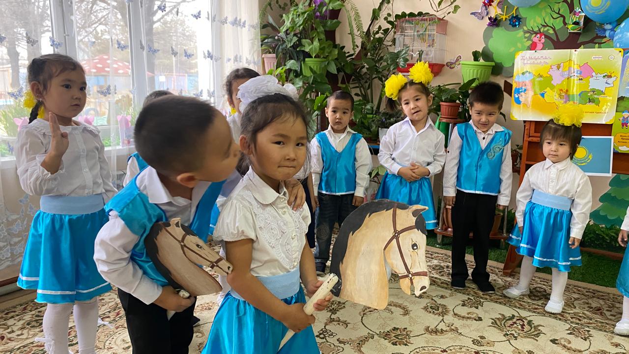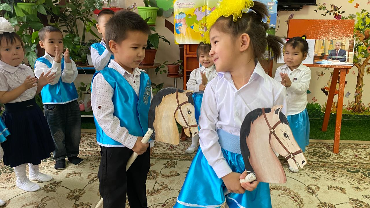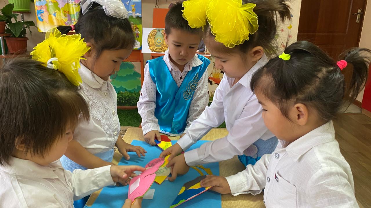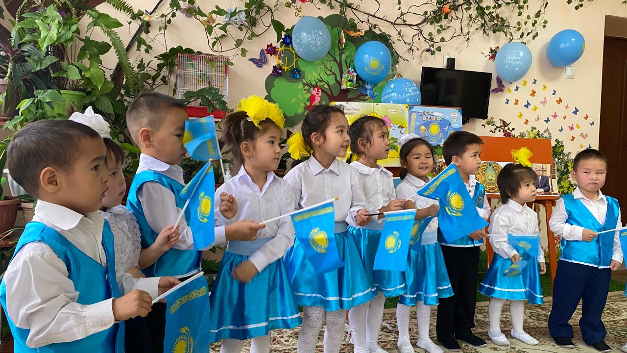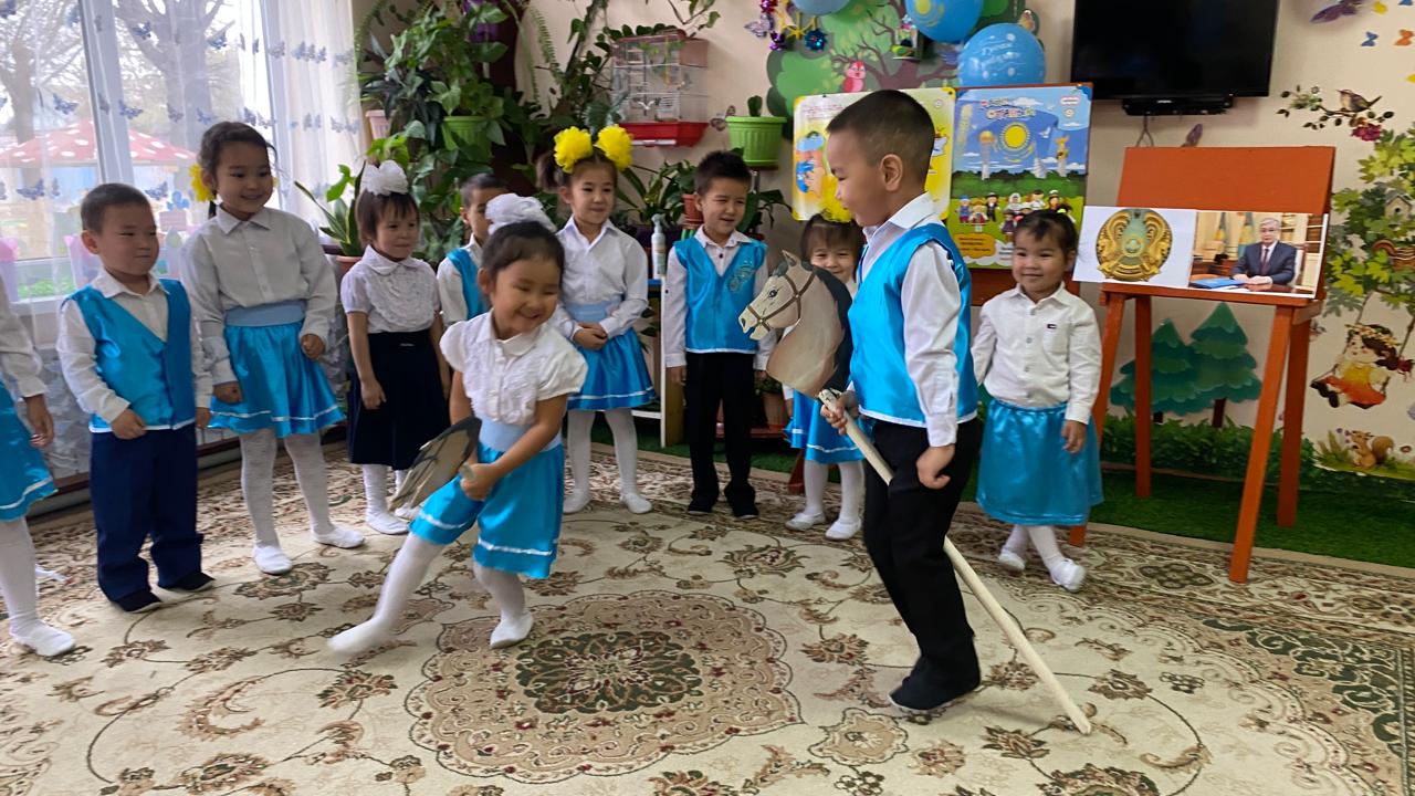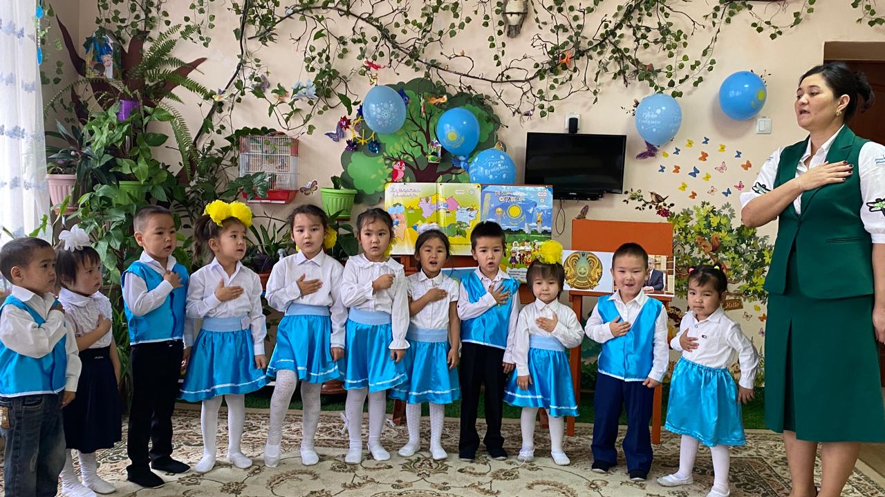 Ортаңғы “Гүлдер” тобында "Адал азамат" біртұтас тәрбие бағдарламасы аясында «Тәуелсіз елім – Қазақстан» тақырыбында тәрбие сағаты өткізілді. Іс-әрекет барысында балалар екі топқа бөлініп, шығармашылық жұмыстар жасады: бір топ күннің сәулелерін жапсырып, екінші топ Қазақстан картасын құрастырды. Сонымен қатар, балалар «Қыз қуу» ұлттық ойынын ойнап, қимыл-қозғалыс белсенділіктерін арттырды. Іс-әрекет балалардың Отанға деген сүйіспеншілігін, шығармашылық қабілеттерін, ұсақ қол моторикасын дамытуға және ұйымшылдық, достық сезімдерін қалыптастыруға бағытталды. Іс-шара қорытындысында балалар «Көк тудың желбірегені» әнімен мерекелік көңіл-күй сыйлады.