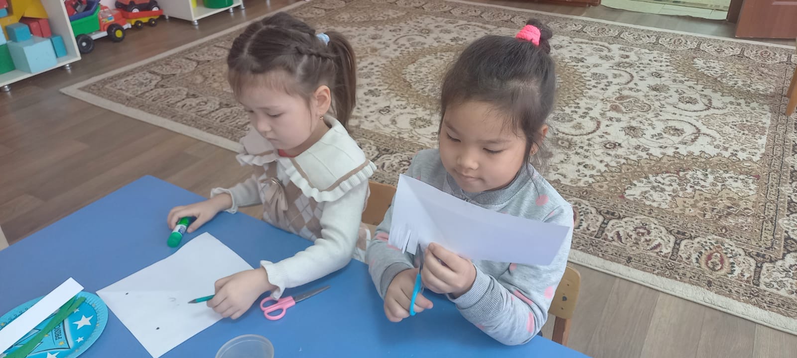 «Көңілді аққалалар» Мақсаты: Қыс қызығымен таныстыру, аққала туралы мағлұмат бере отырып, балалардың шығармашылық қабілеттерін дамыту. Міндеттері: Қайшы мен желімді дұрыс қолдану дағдыларын жетілдіруге, еңбек қауіпсіздігі мен жеке гигиена ережелерін сақтау. Балалар екіге бүктелген қағаздан аққала бейнесін қиып, жасалған дайын құрылыспен бірігіп ойнады. "Айөлек" мектепалды тобы. Бейнелеу өнері жетекшісі: Садыбаева Анар