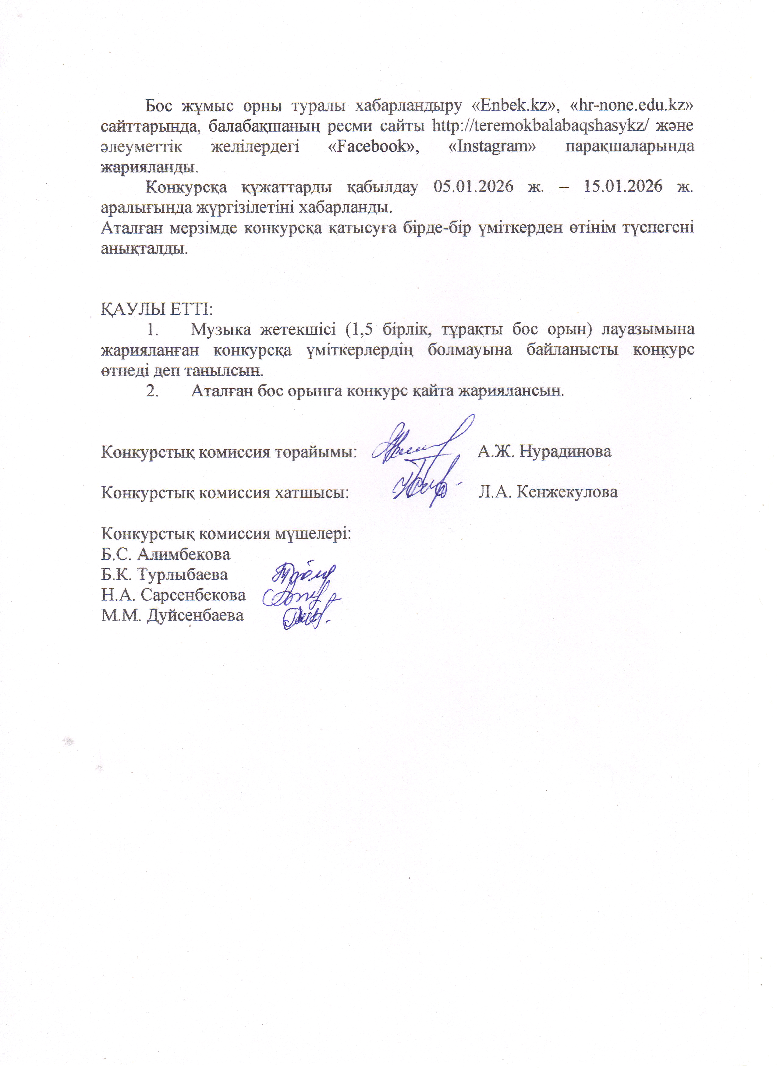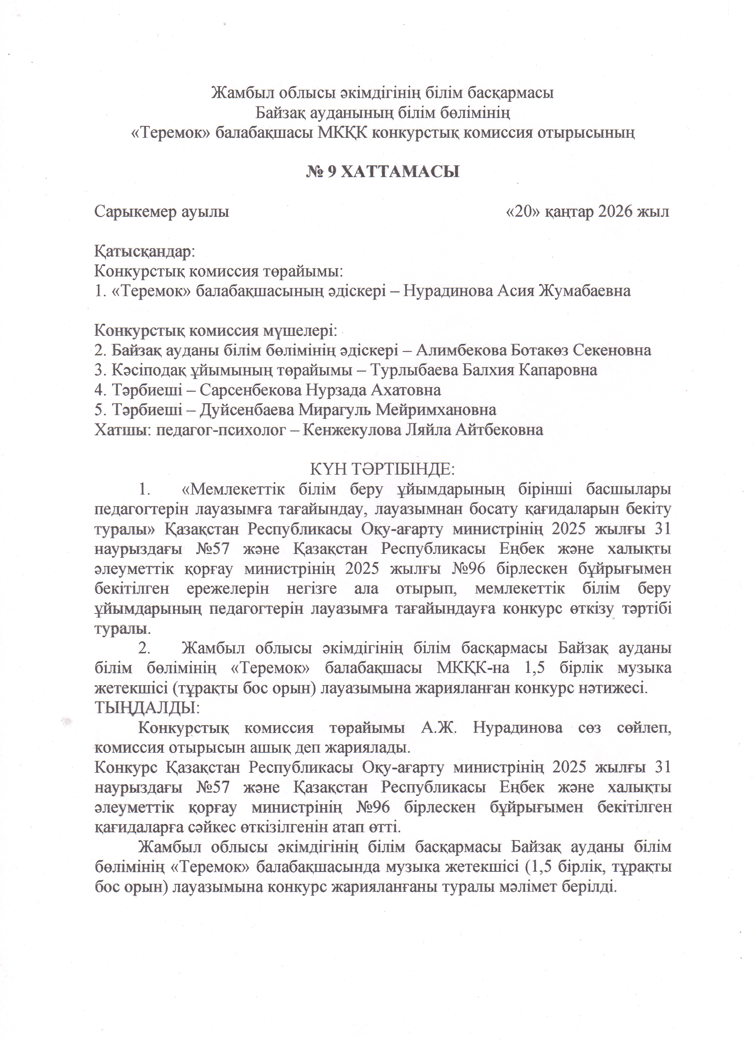 20 январь 2026 0 1 2 3 4 5 Педагогтің бос лауазымына орналасуға арналған конкурстық комиссия отырысының ХАТТАМАСЫ