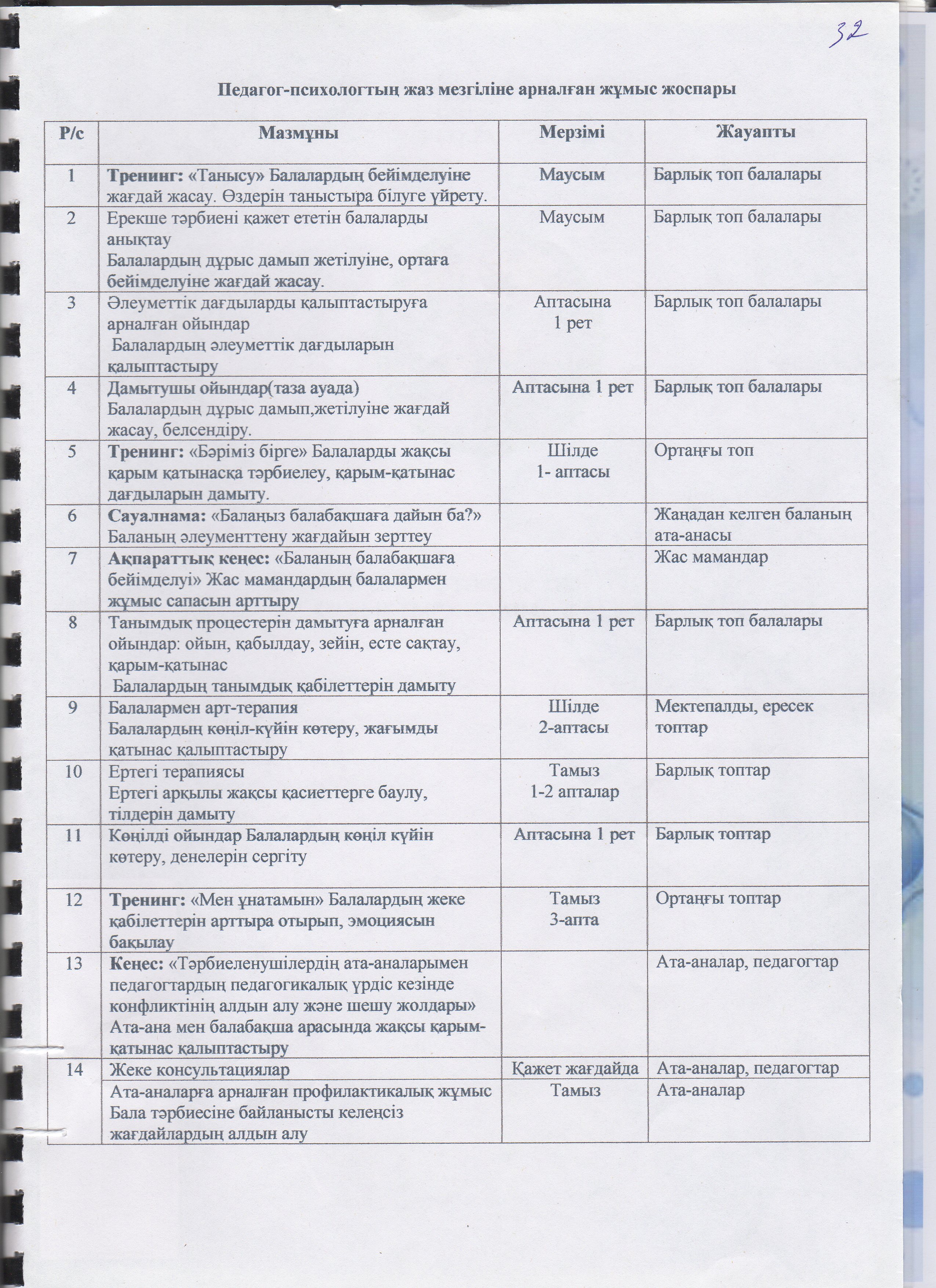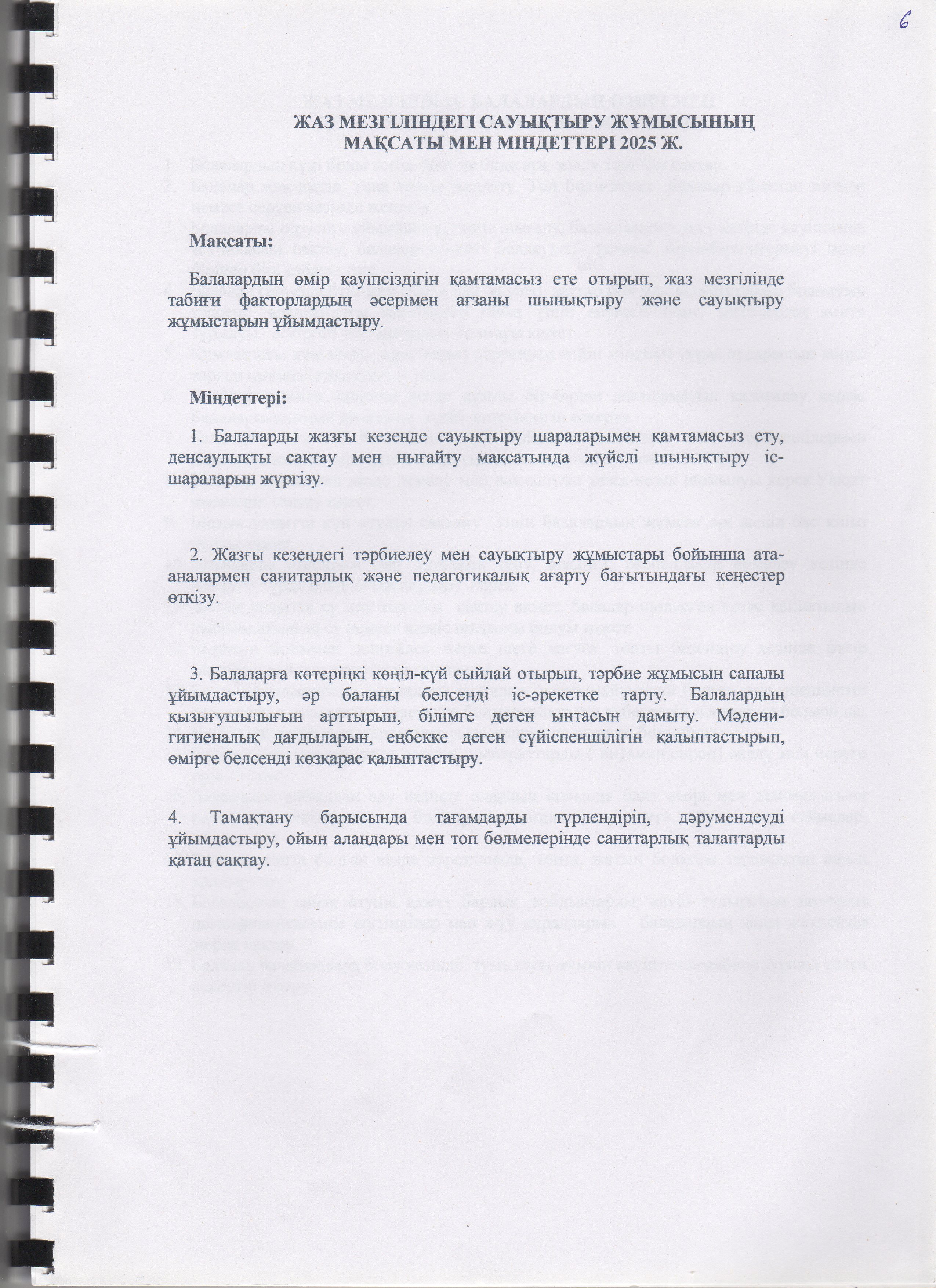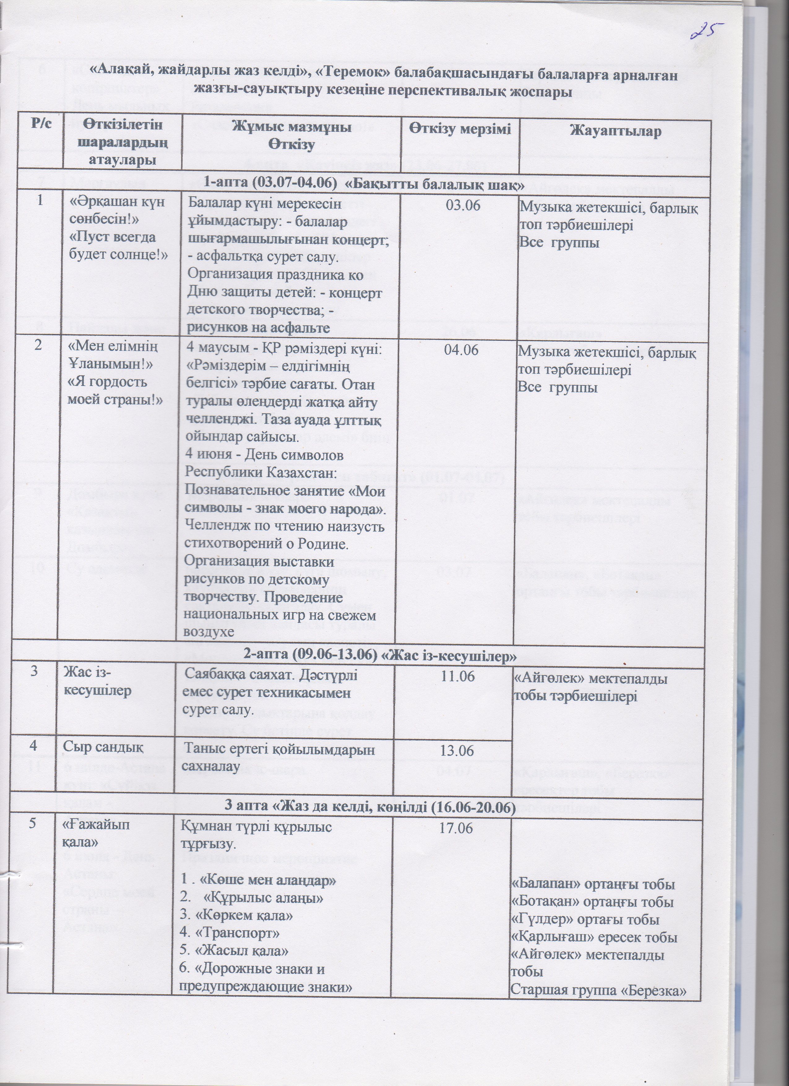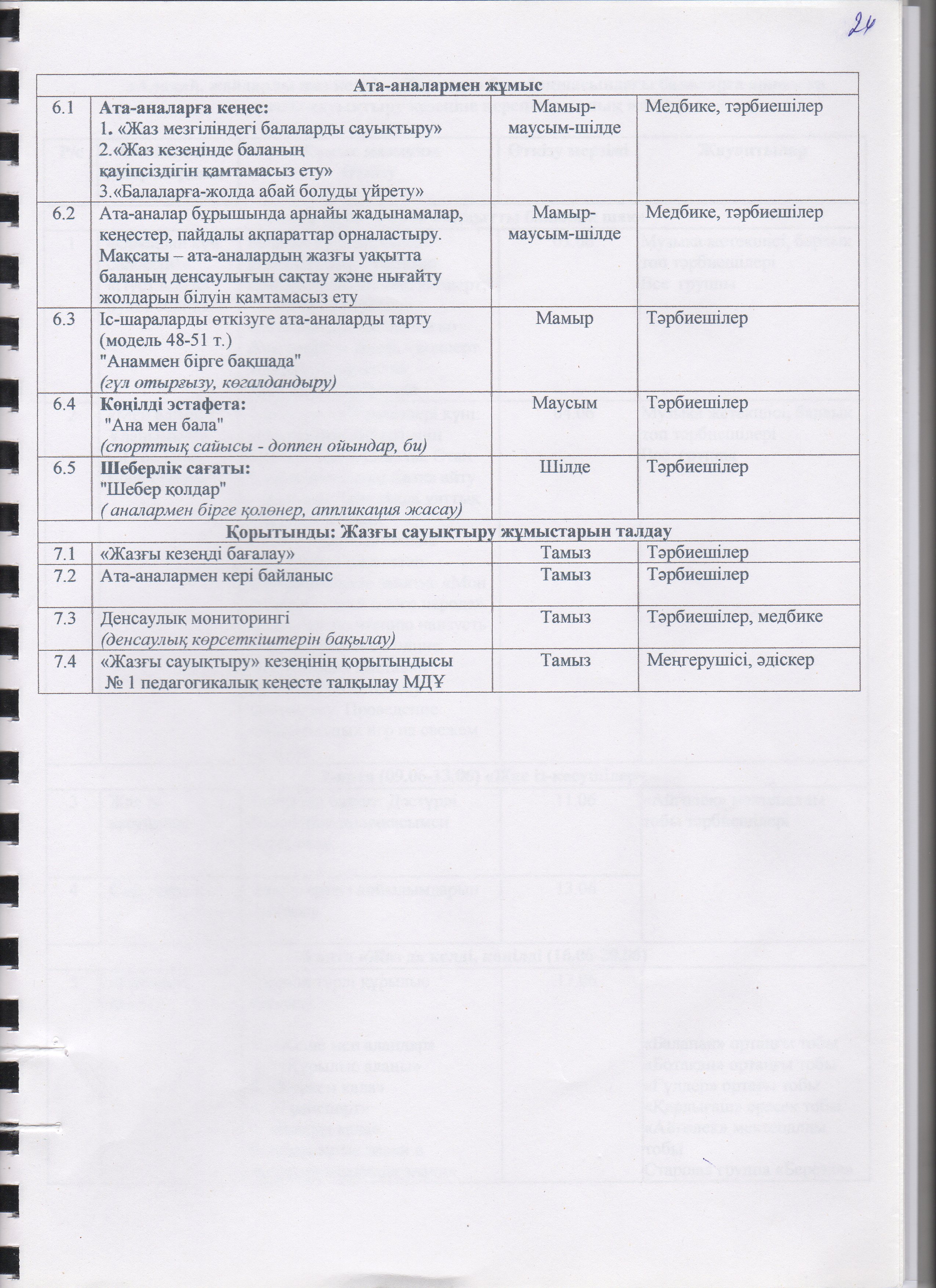 Жаз мезгілінің тәрбие мен оқытудың сауықтыру жұмыс жоспары