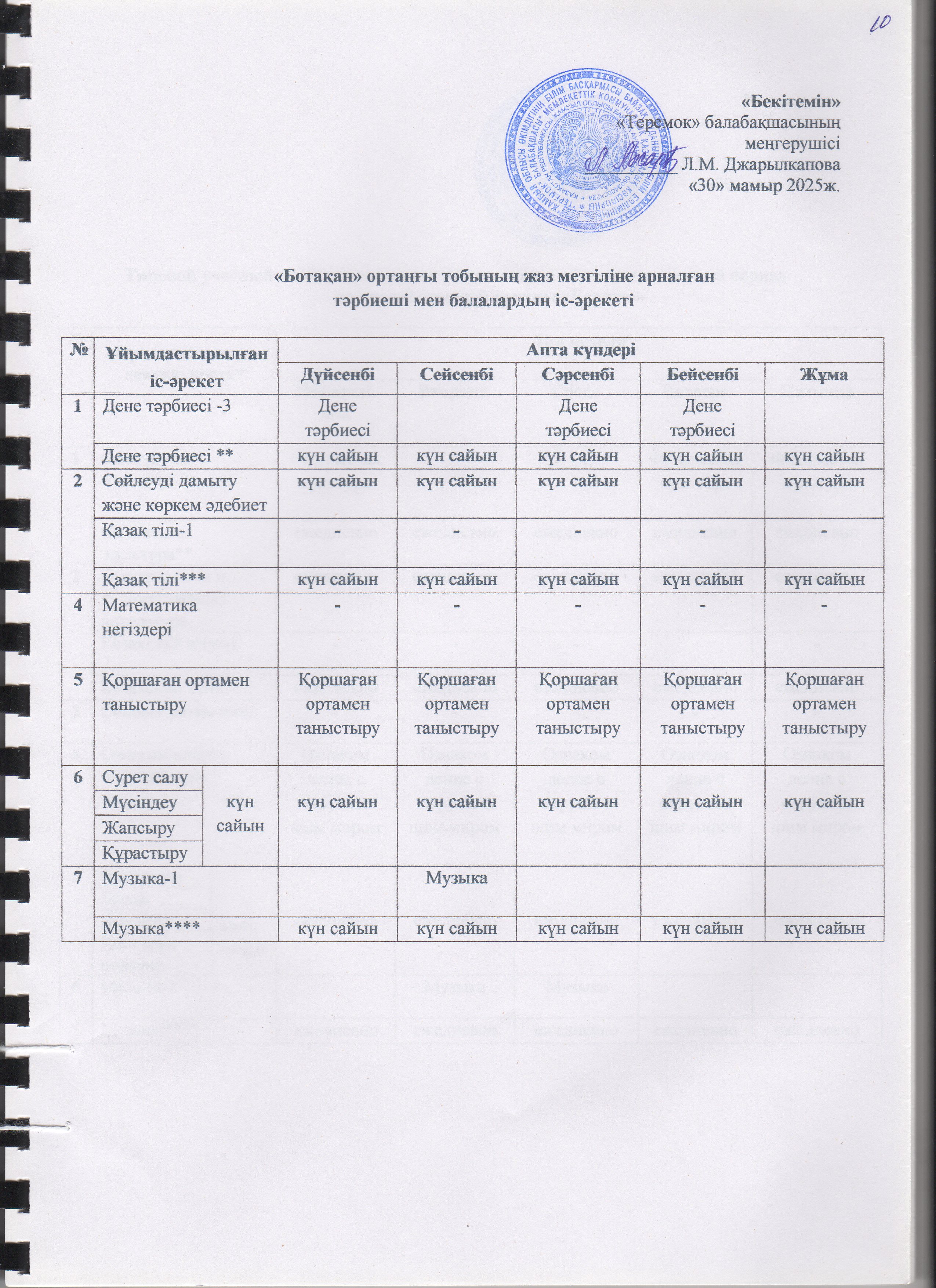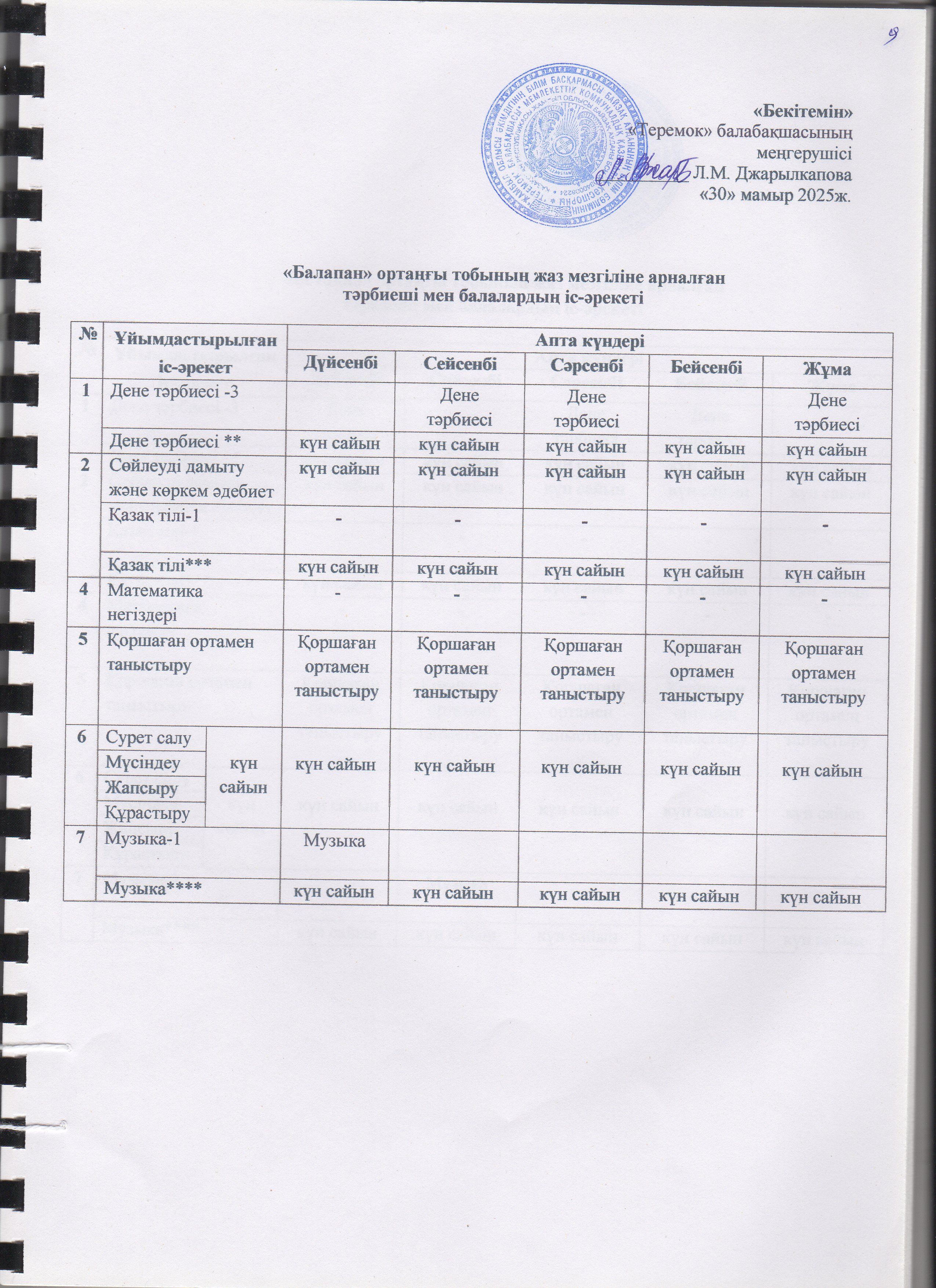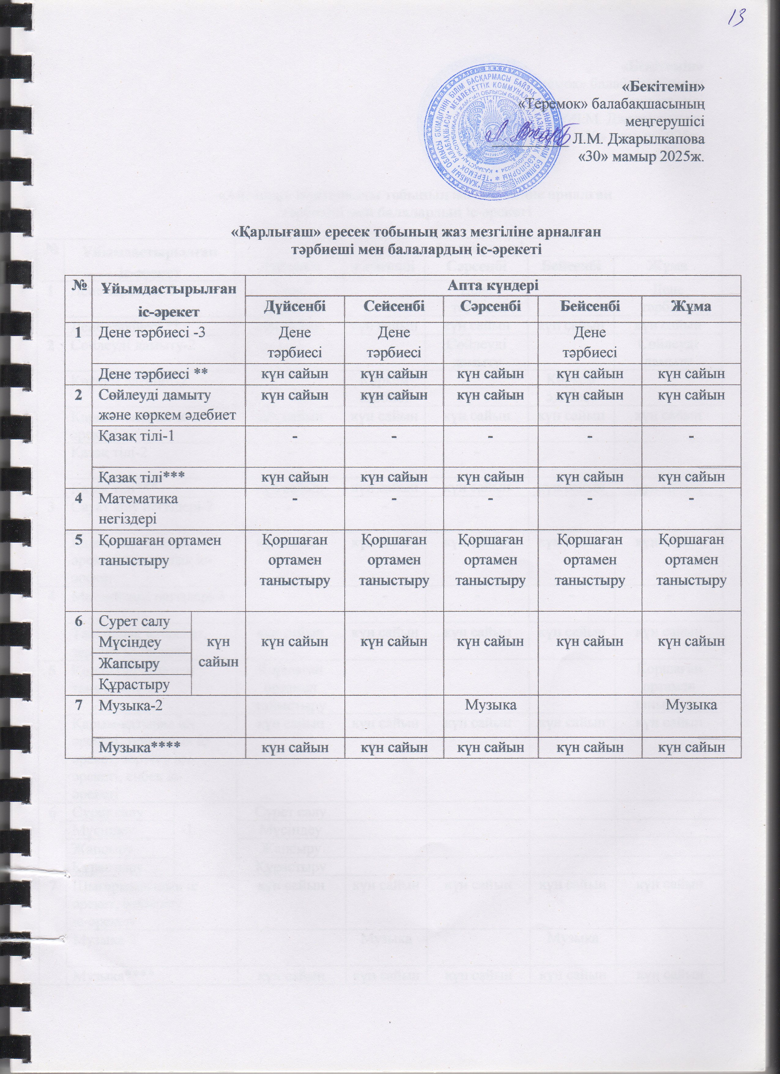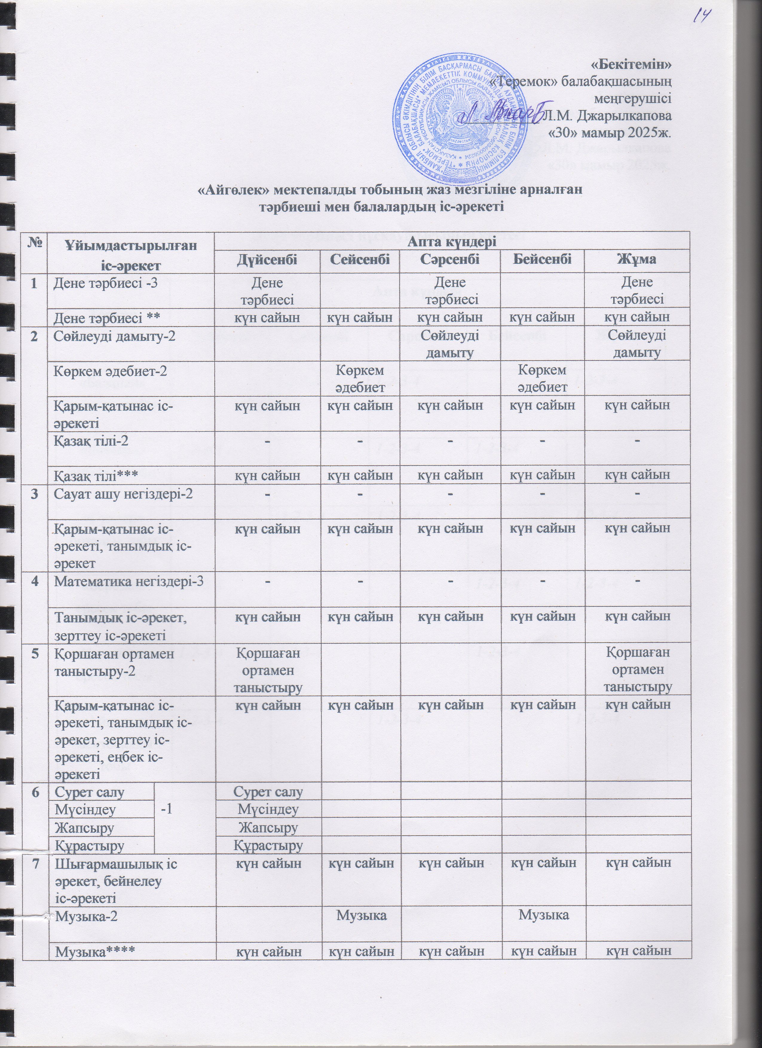 Жаз мезгілінің тәрбие мен оқытудың сауықтыру жұмыс жоспары » "Теремок" балабақшасы