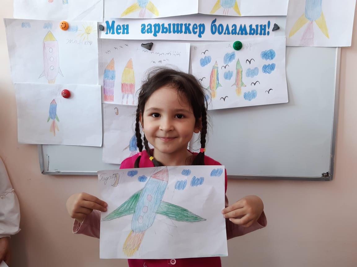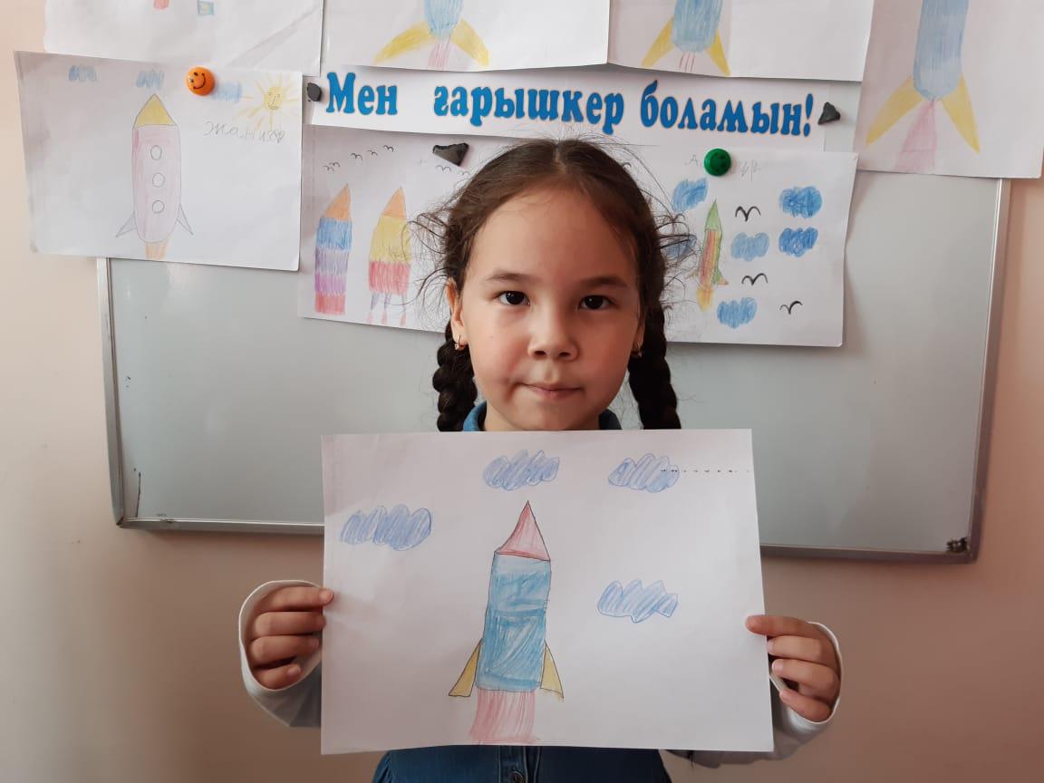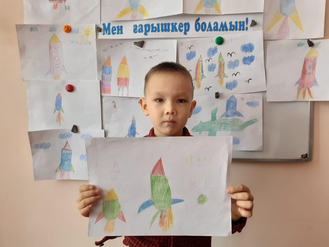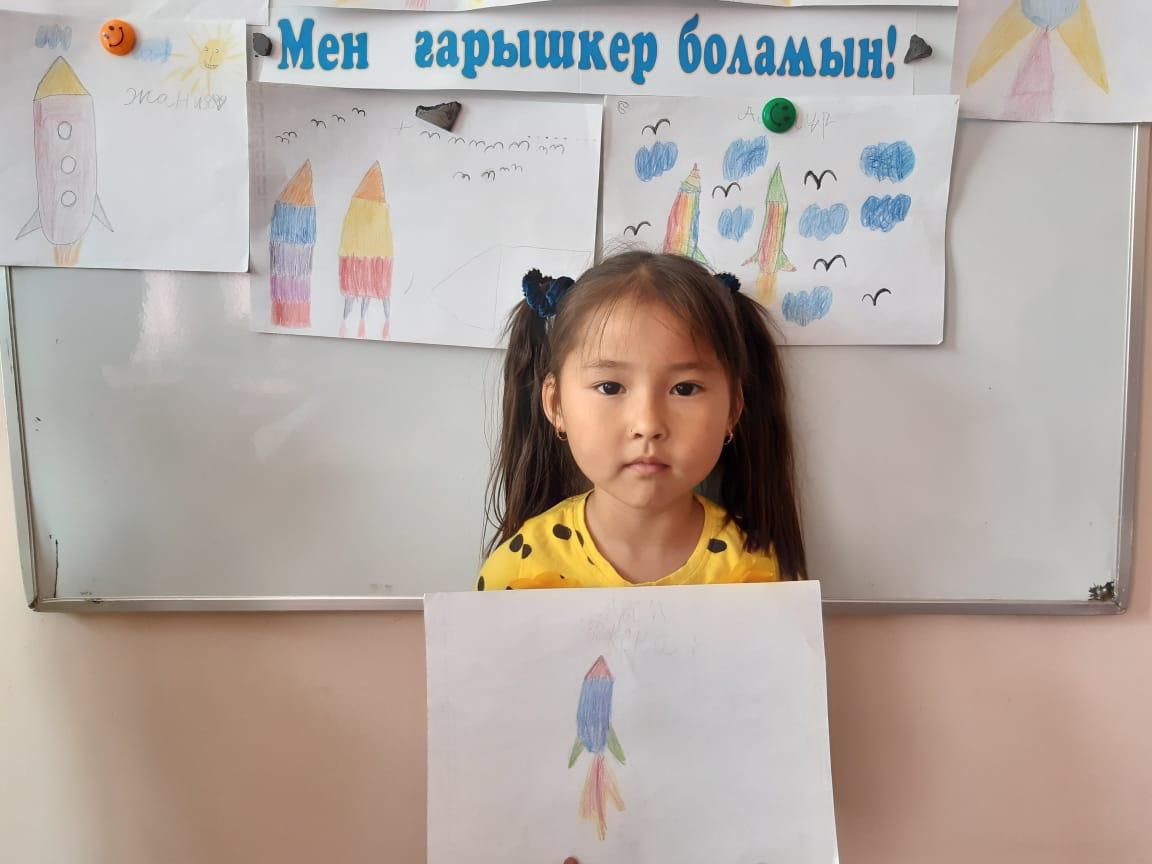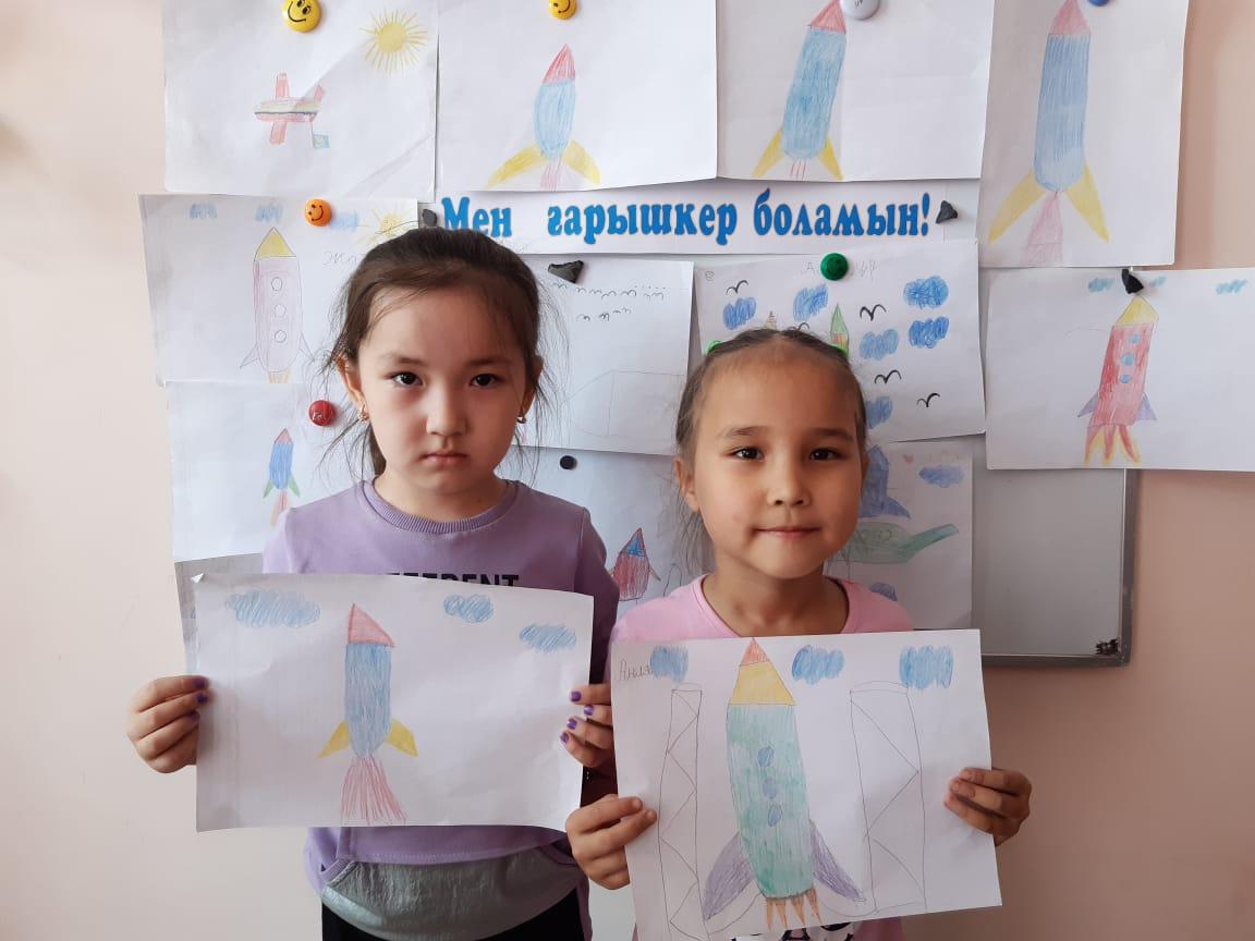12-сәуір Ғарышкерлер күніне орай "Айгөлек" мектепалды тобымен бейнелеу өнері жетекшісі А.Т. Садыбаева "Мен ғарышкер боламын" тақырыбында ұйымдастырылған оқу қызметін өткізді. Оқу қызметі барысында балалардың ғарыш, ғарышкер туралы білімдері, шығармашылық қабілеттері артты. Балалар Ғарыш кемесінің суретін салды.