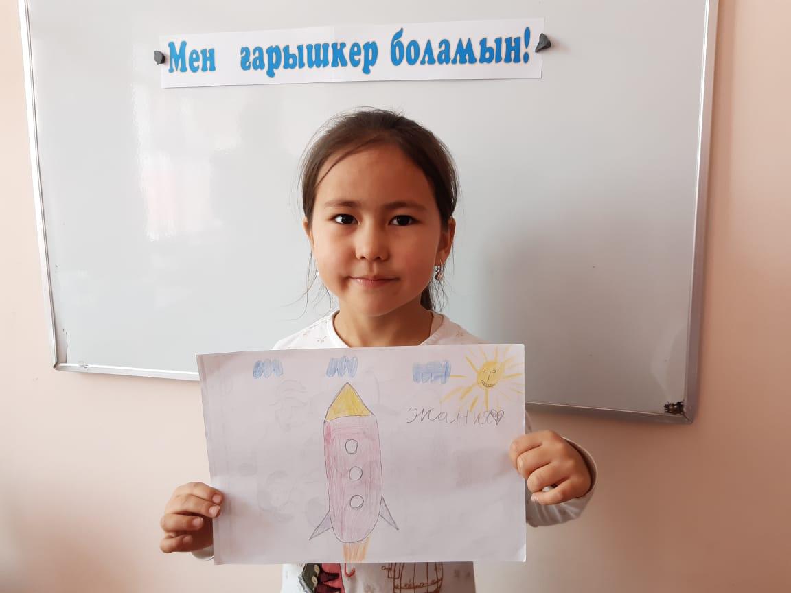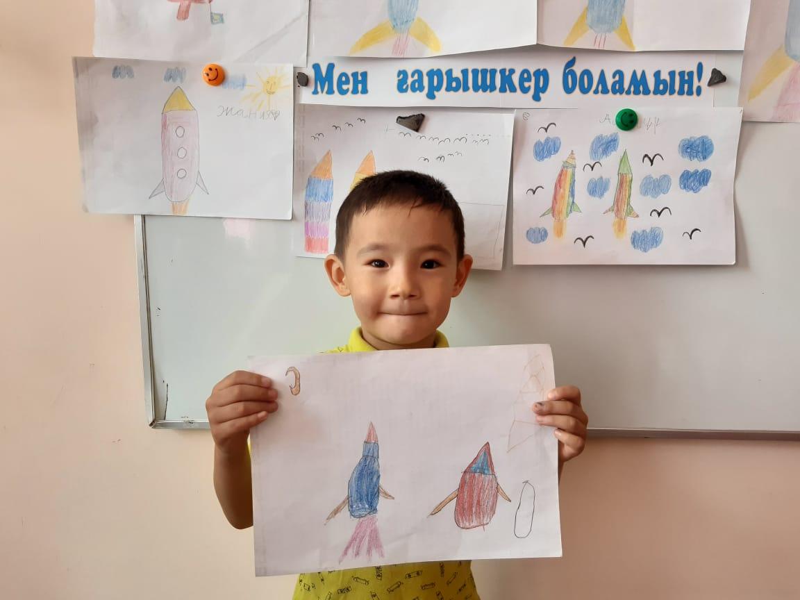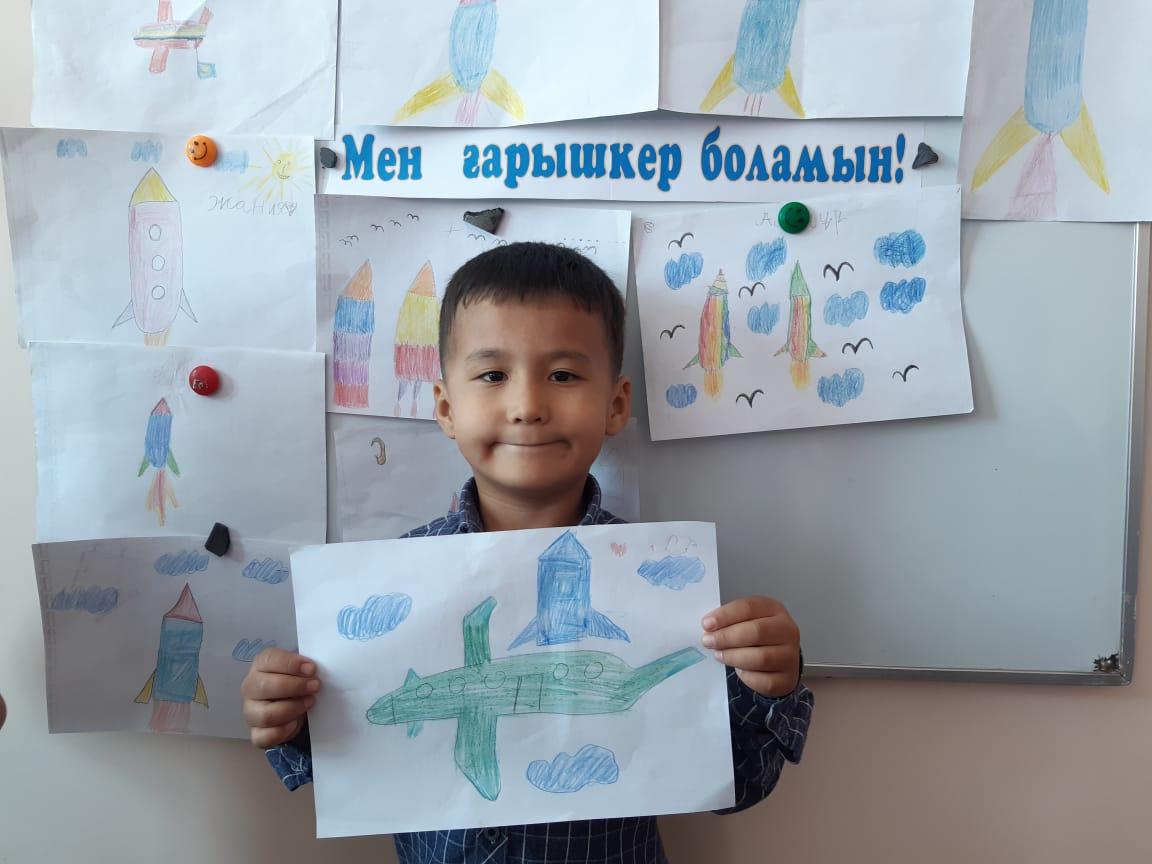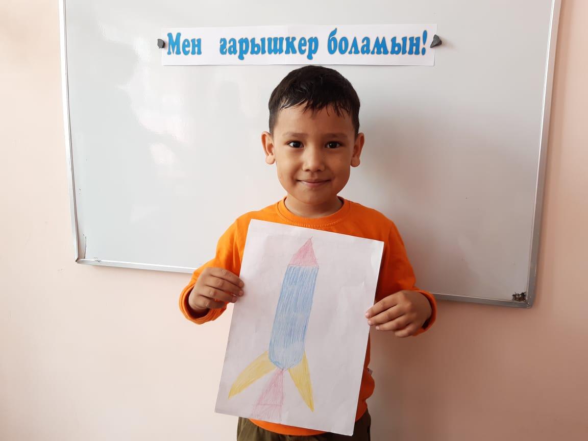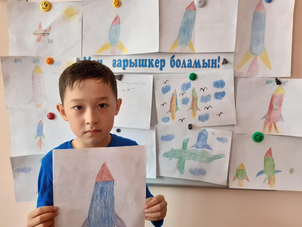 12-сәуір Ғарышкерлер күніне орай "Айгөлек" мектепалды тобымен бейнелеу өнері жетекшісі А.Т. Садыбаева "Мен ғарышкер боламын" тақырыбында ұйымдастырылған оқу қызметін өткізді. Оқу қызметі барысында балалардың ғарыш, ғарышкер туралы білімдері, шығармашылық қабілеттері артты. Балалар Ғарыш кемесінің суретін салды.