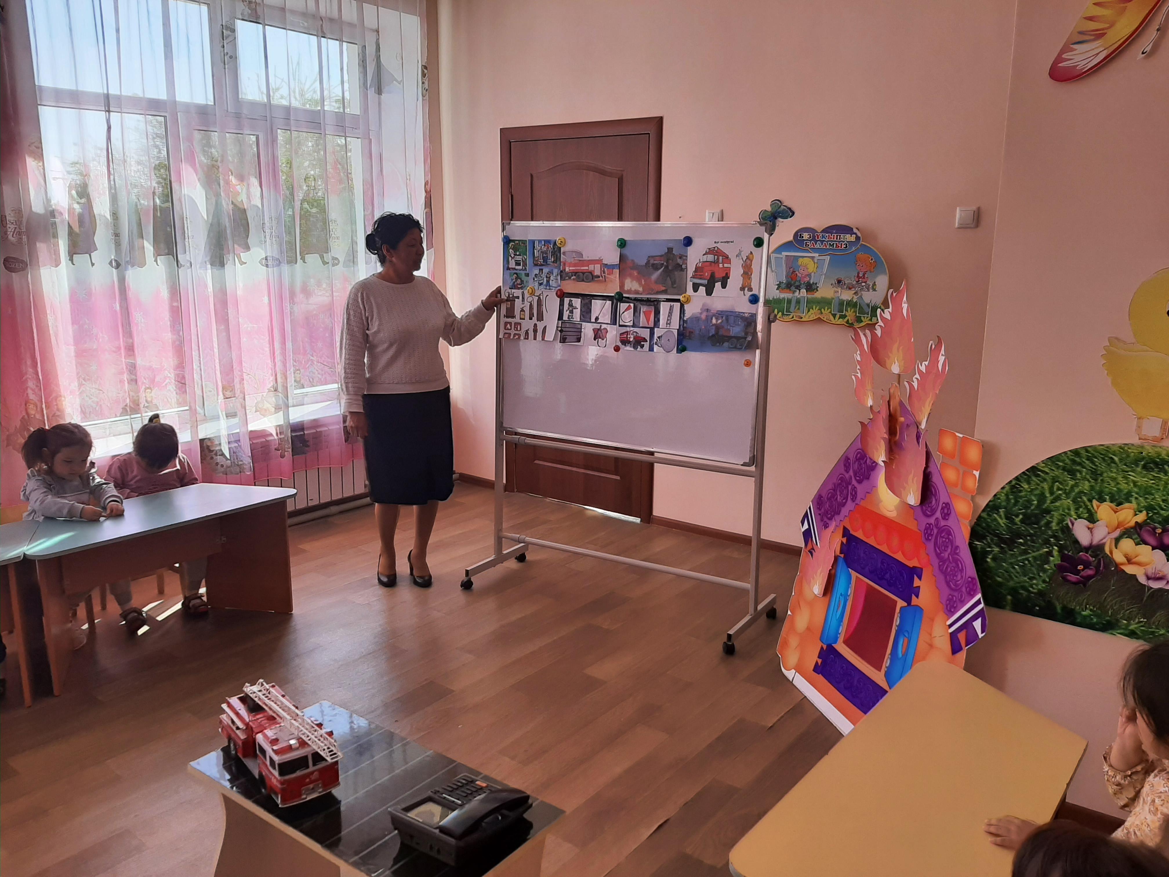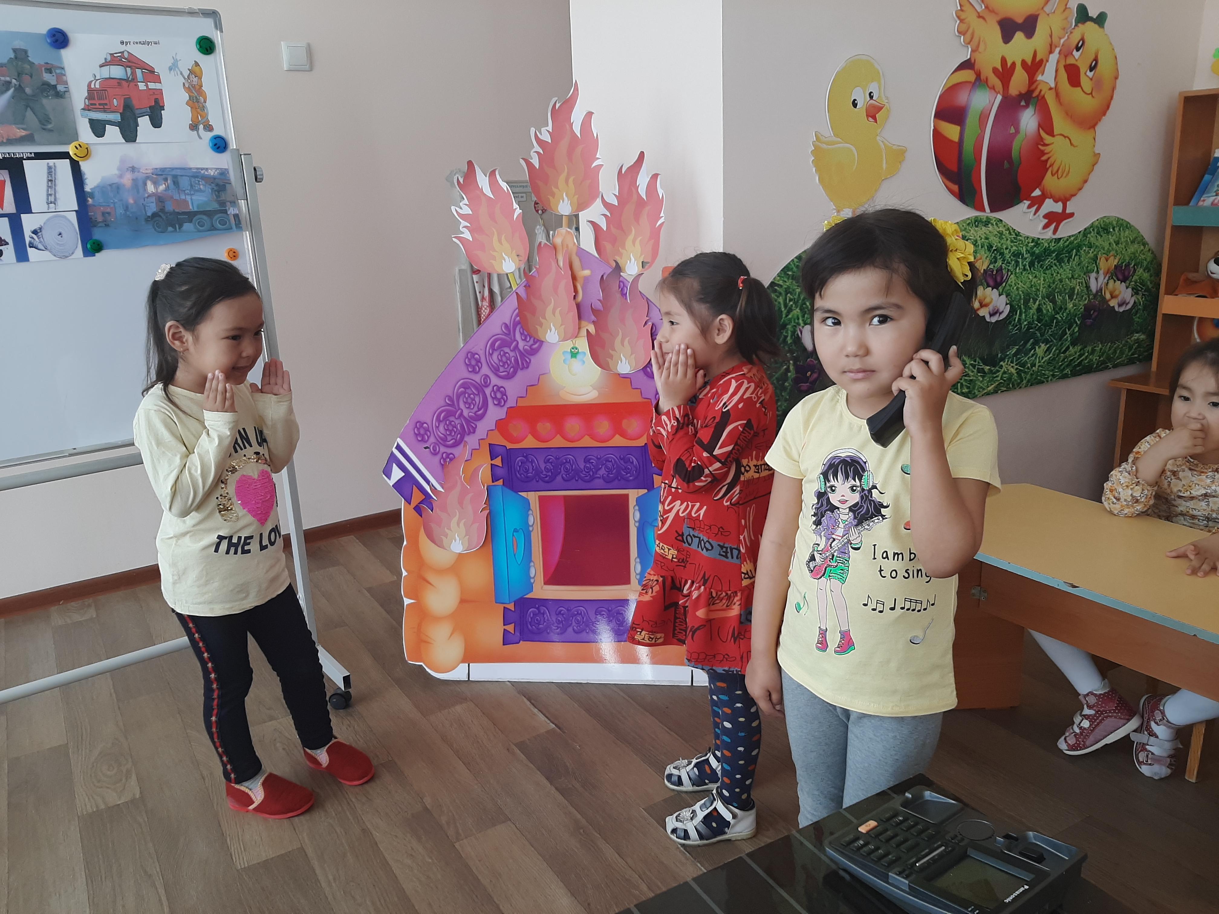 Мақсаты: Балаларға оттан сақтанудың жолдарын, өрттің табиғатқа , адамға әкелетін зардабын түсіндіру. Балалар «Өртті сөндіру» ойынын ойнап, өрт болған жағдайда оны сөндіруге асығу керектігін түсінді. Өртке, отқа байланысты түрлі мақал-мәтелдер айтты. Өрт сөндіру көлігін құрастырды. Балалар ойнай отырып, тапсырмаларды көңілді орындады.