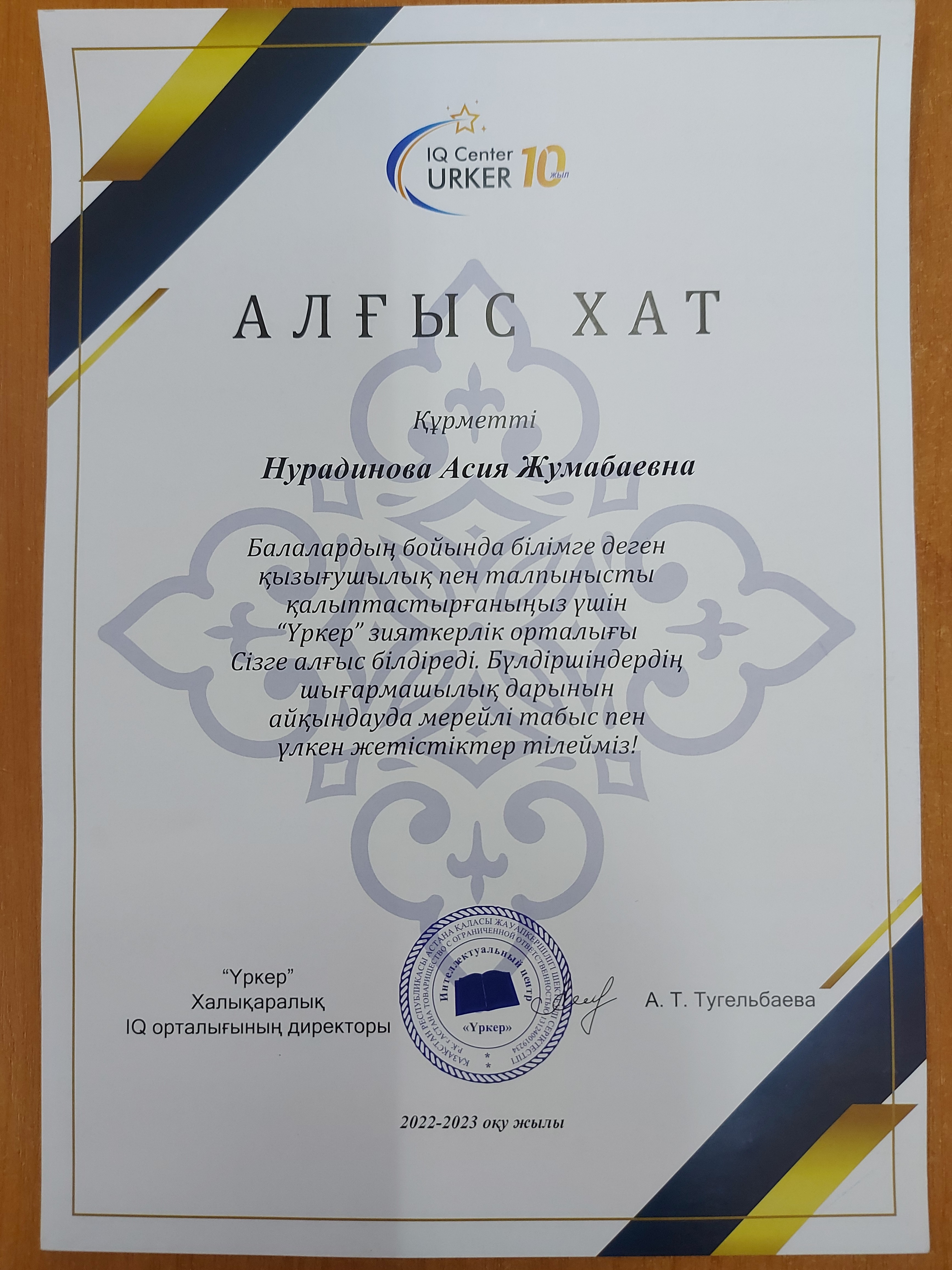 28 ноябрь 2022 0 1 2 3 4 5 ТӘРБИЕЛЕНУШІЛЕРДІҢ ЖЕТІСТІКТЕРІ Білімқұмар балаларға арналған Республикалық "Үркер" зияткерлік марафонына қатысып, балабақша бүлдіршіндері дипломмен марапатталды!Құттықтаймыз!