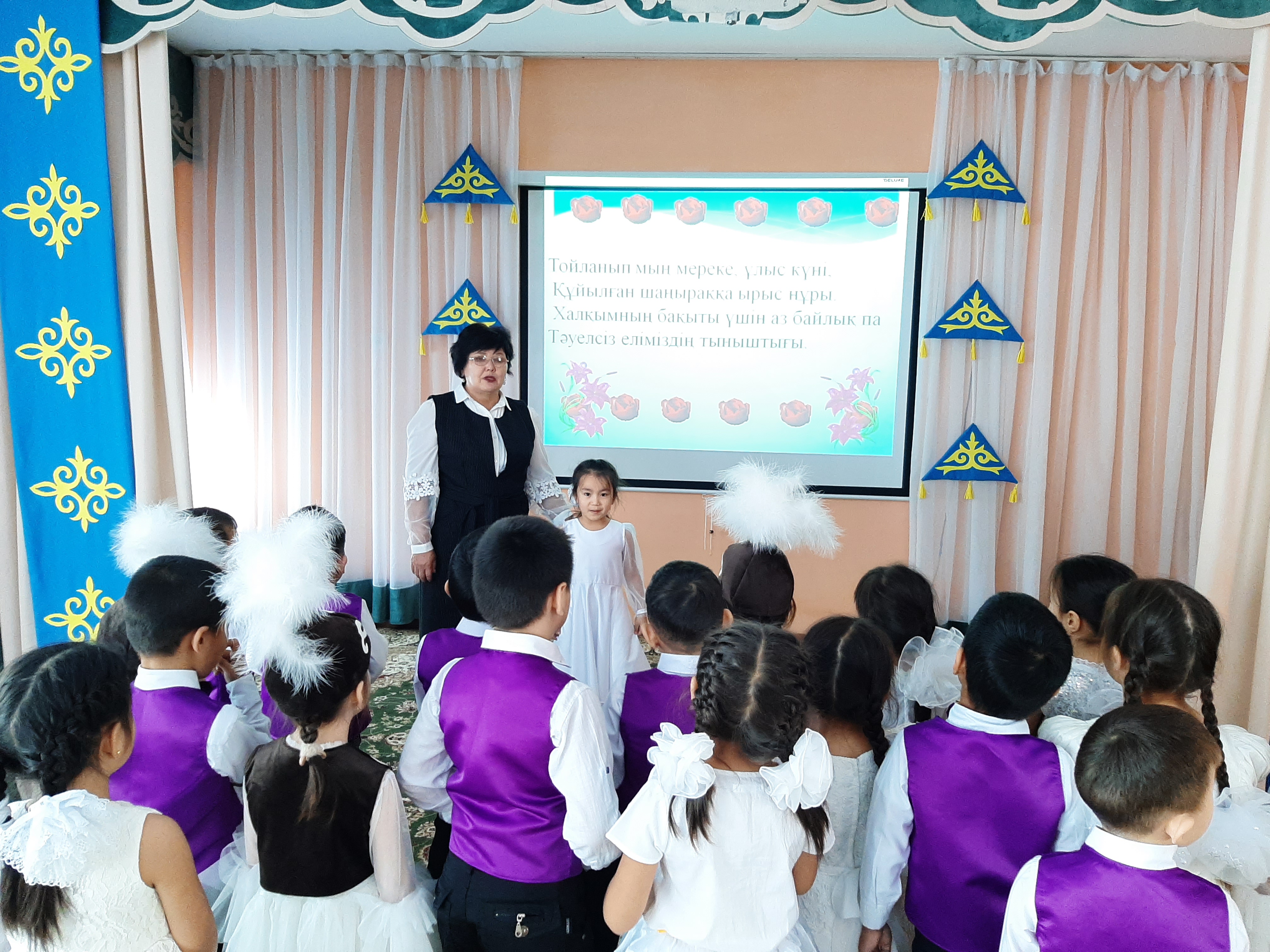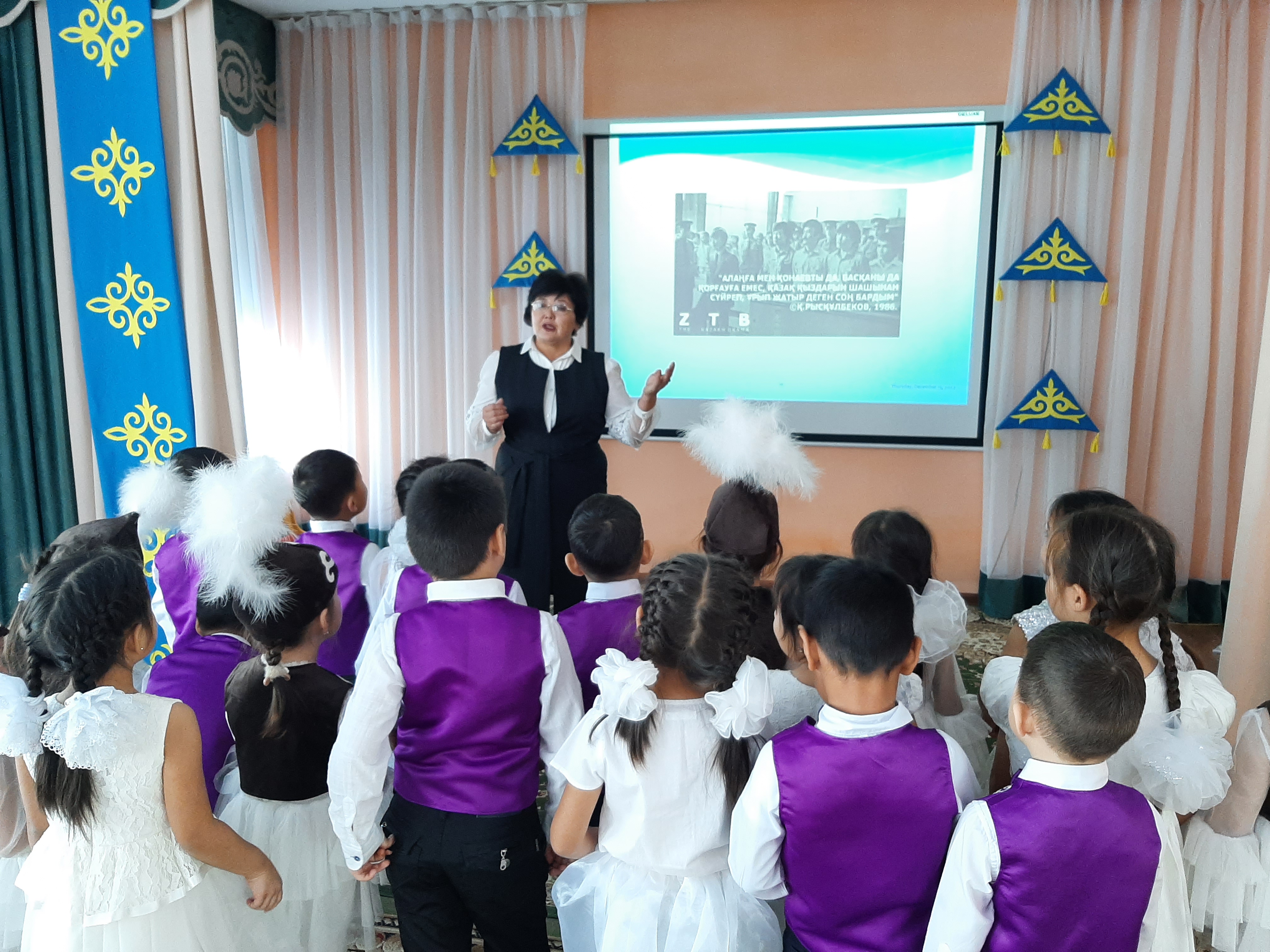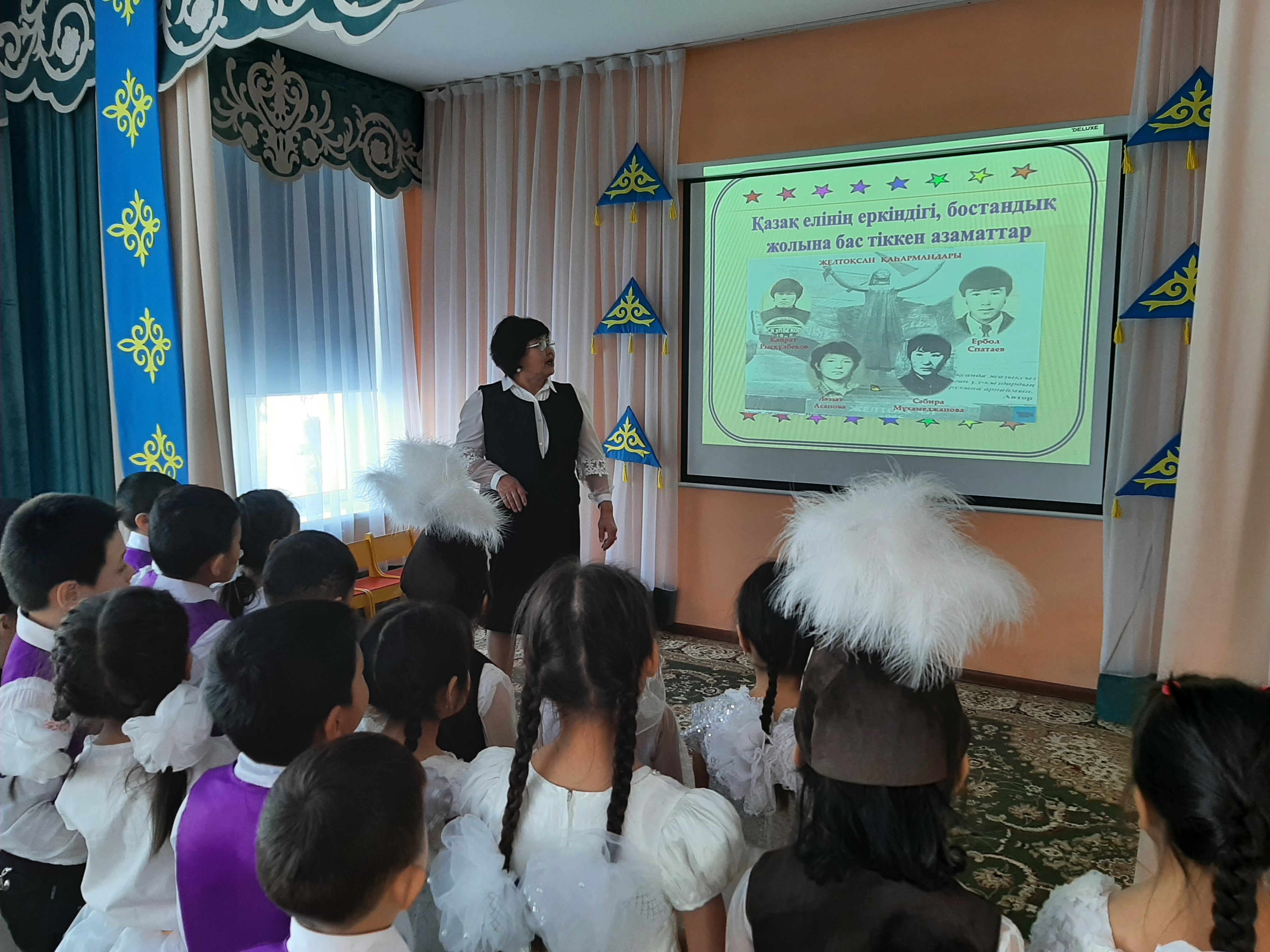 "Айгөлек" мектепалды тобының тәрбиешісі Н.А.Сарсенбекова тәрбиеленушілерге тәуелсіздік күні мерекесі туралы кеңінен түсінік берді. Балалар Отан, Тәуелсіздік, туған жер туралы тақпақтар, мақал-мәтелдер айтты. Балалардың бойында Отанға деген патриоттық сезім қалыптасты.
